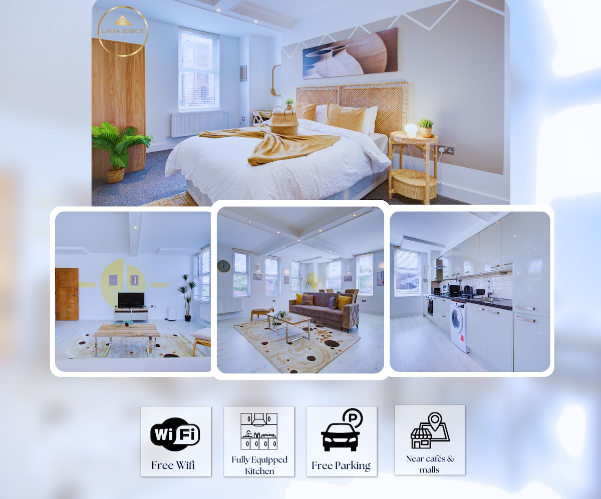 Ciesz się niezrównanym komfortem w naszym mieszkaniu z 2 sypialniami na najwyższym piętrze w centrum Epsom, zaledwie 5 minut od dworca i głównej ulicy. Śpij spokojnie w łóżku typu king, podwójnym lub pojedynczym i zrelaksuj się w stylowej przestrzeni z 55-calowym telewizorem Smart TV, ekspresem do kawy i nie tylko. Skorzystaj z bezpiecznego parkingu, spokojnej okolicy i bliskości miasta. Nowoczesna estetyka spotyka się z praktycznością w naszym niedawno odnowionym, bezpiecznym budynku. Idealne do zwiedzania Surrey lub zanurzenia się w ciszy. Twój spokojny, elegancki wypoczynek w samym sercu miasta!