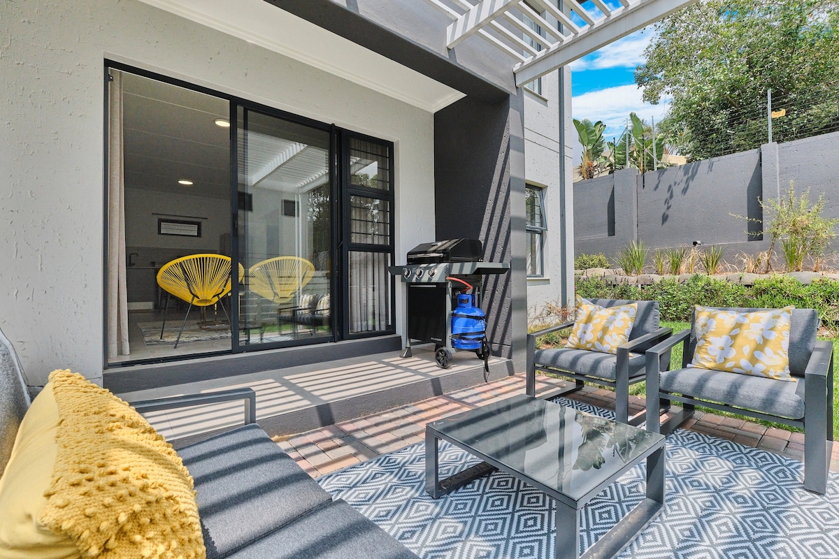 We welcome you to relax in our calm and luxurious space situated in a quiet section of Fourways. The apartment is uniquely and tastefully designed with amenities that radiate style and comfort. Treat yourself to this stunning apartment with a queen size bed, a fully equipped kitchen and a modern bathroom. Unwind on the patio or on the couch and enjoy a TV with Netflix and Youtube. The apartment has electricity backup that runs the TV and the Wi-Fi. Book your stay today and indulge in luxury.