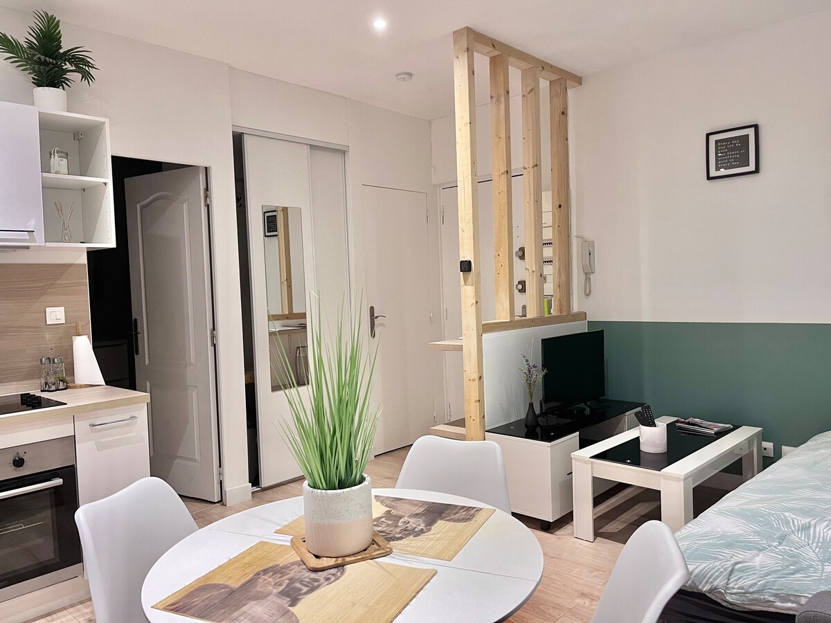 Apartament położony 14 minut od lotniska Roissy CDG! (bez hałasu) Może pomieścić do 2 osób w sypialni i salonie (rozkładana sofa 2 osobowa), łazienka, kuchnia. Położony w centrum miasta Dammartin en Goëlle. Możesz korzystać z wielu atrakcji i spacerów po lesie (patrz poniżej). Idealne na pobyt służbowy.