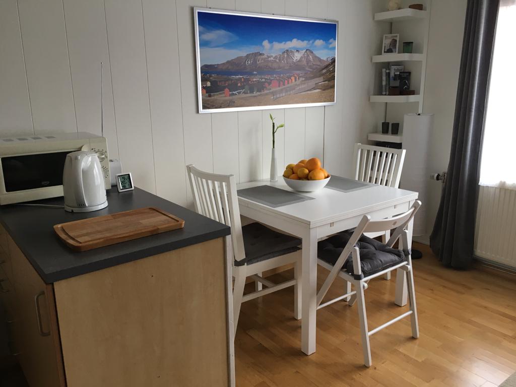 Ładne mieszkanie z prywatnym wejściem, salonem z rozkładaną sofą, łazienką, kuchnią i sypialnią z łóżkiem o szerokości 120 cm. Idealne dla dwóch osób, jednak może pomieścić cztery, jeśli jesteście dobrymi przyjaciółmi! Ładna lokalizacja na wzgórzu Gruvedalen. Około 5 minut spacerem od centrum miasta Longyearbyen. Wi-Fi wliczone w cenę. Brak pralki