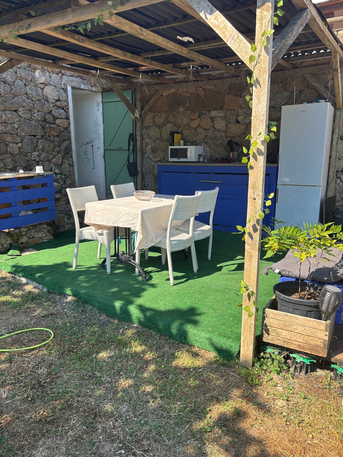 Dom z granitu, w wiosce Casabianca, podzielony na 2 apartamenty (zobacz mój profil). Do dyspozycji gości jest apartament na parterze (22 m²). Składa się z w pełni wyposażonego salonu/kuchni z telewizorem, a także sypialni z telewizorem i łazienki/WC. Do apartamentu należy połowa placu znajdującego się za domem. Będziesz mieć dostęp do stołu i grilla. Suszarnia jest wspólna z drugim apartamentem.