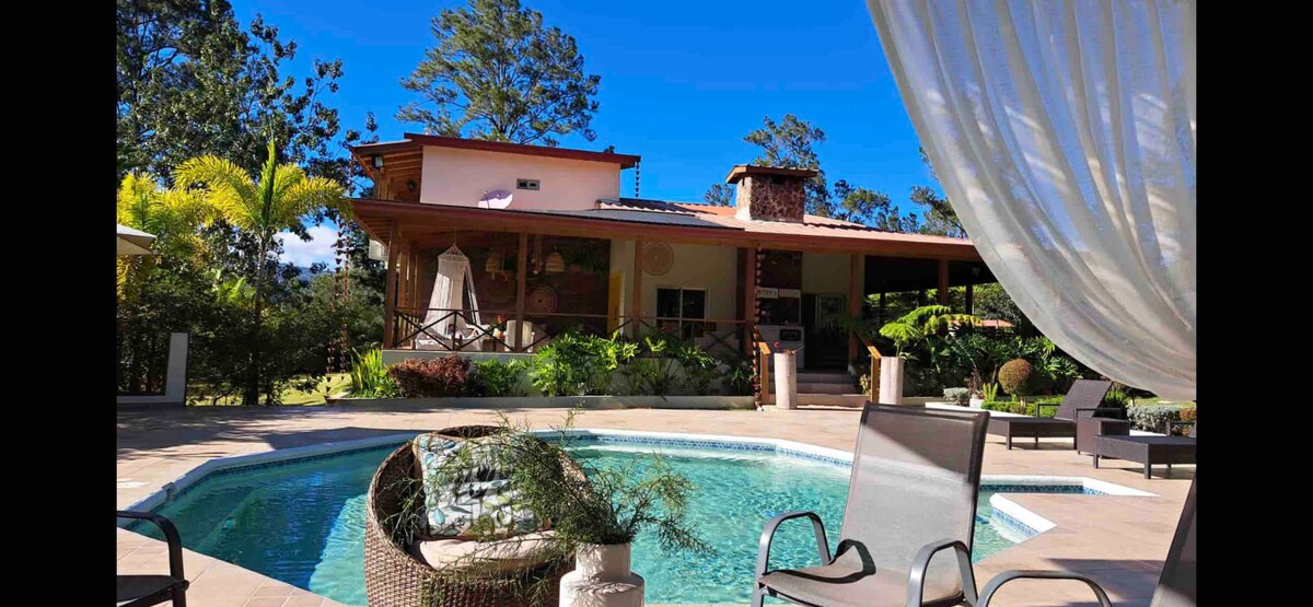 (Absolute privacy) Espectacular one bedroom Villa located 14 min from the center of jarabacoa easy access on any type of car. Uniquely and personalized built to help couples scape from the wourld to a private and peaceful Stay. Private and heated pool right at the bedroom side, 360° rotating TV, king size bed, Elegant kitchen and amazing bathroom. Free wifi power by starlink.