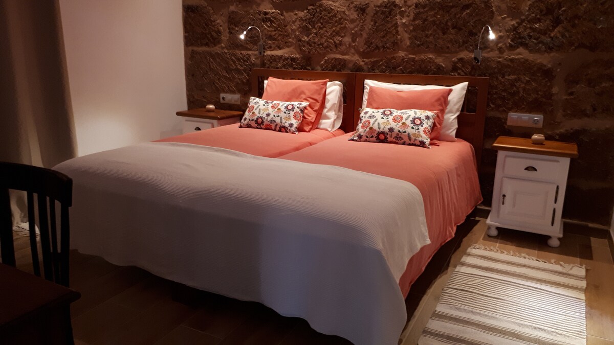 Bonito apartamento en casa rural de 3 plantas. Es la planta del centro. Se encuentra en la parte alta del Valle. Para acceder a la casa hay que subir escaleras, por lo que el acceso no es adecuado para minusválidos. Recomendamos coche para moverse por la zona. Zona muy tranquila con unas vistas espectaculares, de las que podrás disfrutar en su amplia terraza. Tiene filtro de osmosis inversa, por lo que dispondrás de agua potable. Aire acondicionado y aire caliente (la chimenea es decorativa)