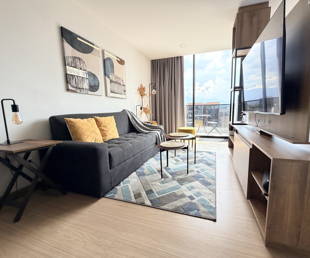 Nowoczesne studio na najwyższym piętrze w Laureles z widokiem na góry i prywatnym balkonem. 5 minut spacerem do najlepszych restauracji i lokali nocnych w Laureles. Obejmuje 1,5 łazienki, szybkie Wi-Fi, w pełni wyposażoną kuchnię, klimatyzację, pralko-suszarkę, telewizor Smart TV oraz prywatny parking dla gości. Zrelaksuj się w cichym, bezpiecznym budynku z całodobową ochroną. Idealne miejsce na dłuższe pobyty, dla cyfrowych nomadów i gości poszukujących komfortu, przestrzeni i doskonałej lokalizacji.