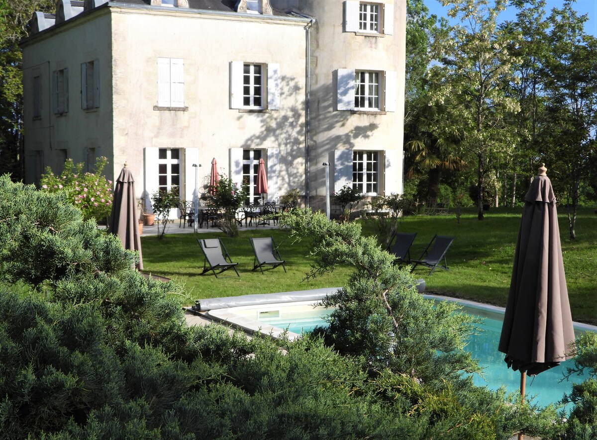 La Comtesse est une demeure de charme située au calme au sommet d'une colline. Originale avec de beaux volumes, ses 6 chambres, dont 3 dans des tours rondes, bénéficient de salles de bain et wc privatifs. Connexion internet haut débit par fibre ; parfait pour télétravail. 3 salons. 1 par niveau. Parc de 2 hectares et piscine chauffée. Sans vis à vis. Piscine chauffée.