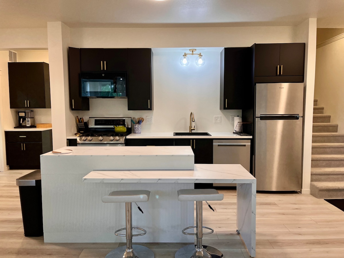 Relax in this stylish studio - so much more comfortable than a stale hotel room! Boasting a well-equipped kitchenette with convection micro, 2 burner stovetop, sink, dishwasher, and fridge, you can eat in if you chose. The zero-entry rain shower is fantastic. Washer/dryer, cotton linens, down comforter/pillows, & a smart TV. This cozy nest is perfect for a comfy evening watching your favorite show. Less than a mile from oldtown Loveland, where you'll find lots to eat, drink, and do!