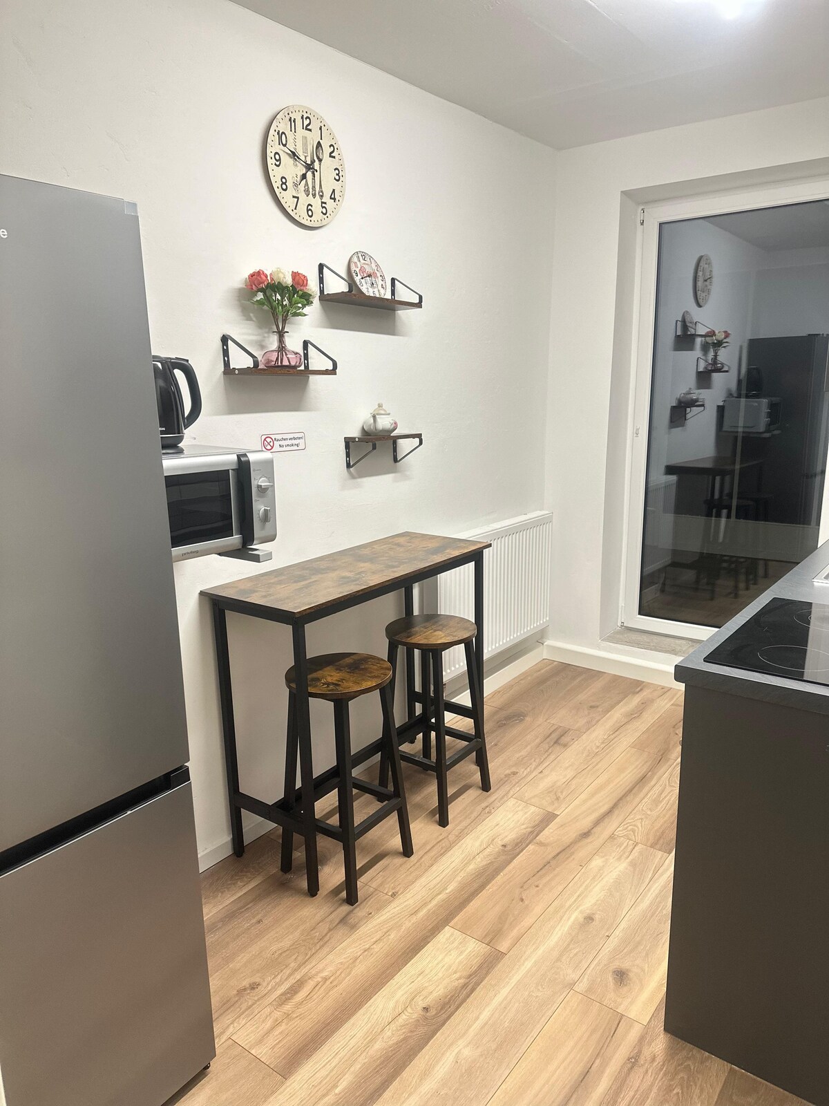 Modernes, sehr schönes 1-Raum APP mit 2 Einzelbetten od. Doppelbett und Schlafsofa, voll augest. Küche mit Mikrowelle, Kaffee/Senseo, Kühlschrank, Geschirrspüler etc. gemütliche Sitzecke und Flachbild SAT-TV, mit Terrasse und Gartenmöblen. Eine Waschmaschine/Trockner ist im Haus in der ersten Etage gg. Gebühr vorhanden, privates Bad mit Dusche. Reinigung+Bettwäsche im Preis enthalten...