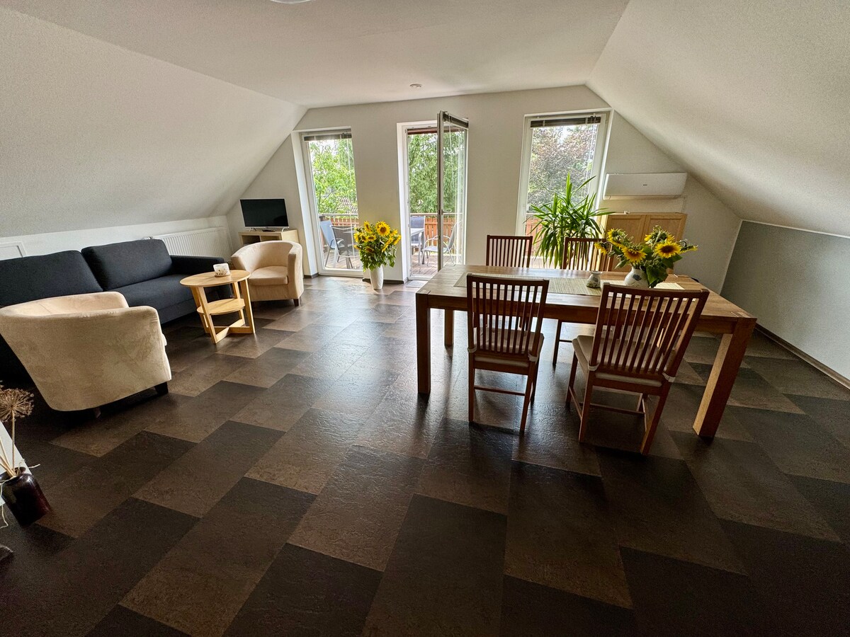 Oferujemy jasne, bardzo przestronne, przytulne i w pełni wyposażone mieszkanie na poddaszu. Bardzo duży balkon (ok. 3x7m) z widokiem na zachód ma wysoką wartość rekreacyjną i relaksacyjną, szczególnie wieczorem. Nasz dom jest położony w idyllicznym miejscu na obrzeżach zadbanego przedmieścia Lübben. Lübben jako brama do Górnego i Dolnego Spreewaldu jest doskonałą bazą wypadową dla wycieczek do obu regionów. Trasa rowerowa Gurkenradweg prowadzi bezpośrednio obok domu. Jako gospodarze chętnie służymy pomocą wskazówkami.