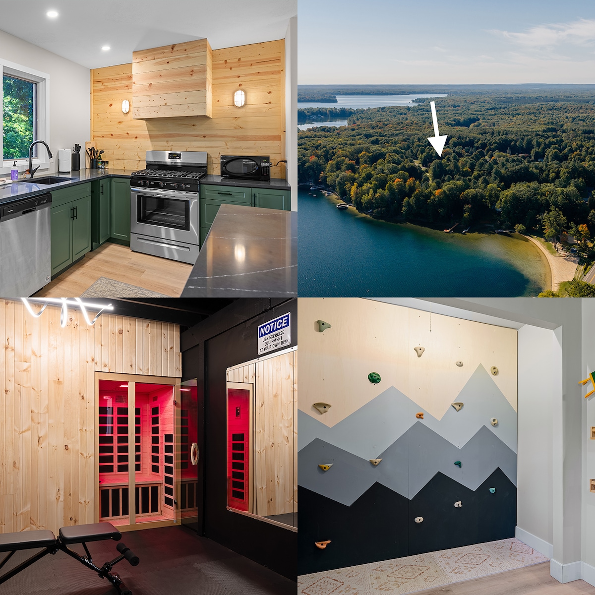 Escape to this private, peaceful family retreat—perfect for large groups! Sleeps 17+ across 2 separate mid-century modern buildings, each with its own kitchen and living space. Enjoy 250 ft of sandy beachfront, crystal-clear water, a playground, sauna, hot tub, ping pong, paddle boards, and kayaks. Unwind in the spacious outdoor living area surrounded by nature. Ideal for making memories, relaxing, and reconnecting—your secluded lakeside paradise awaits! Just 7 minutes from Michigan’s Adventure.