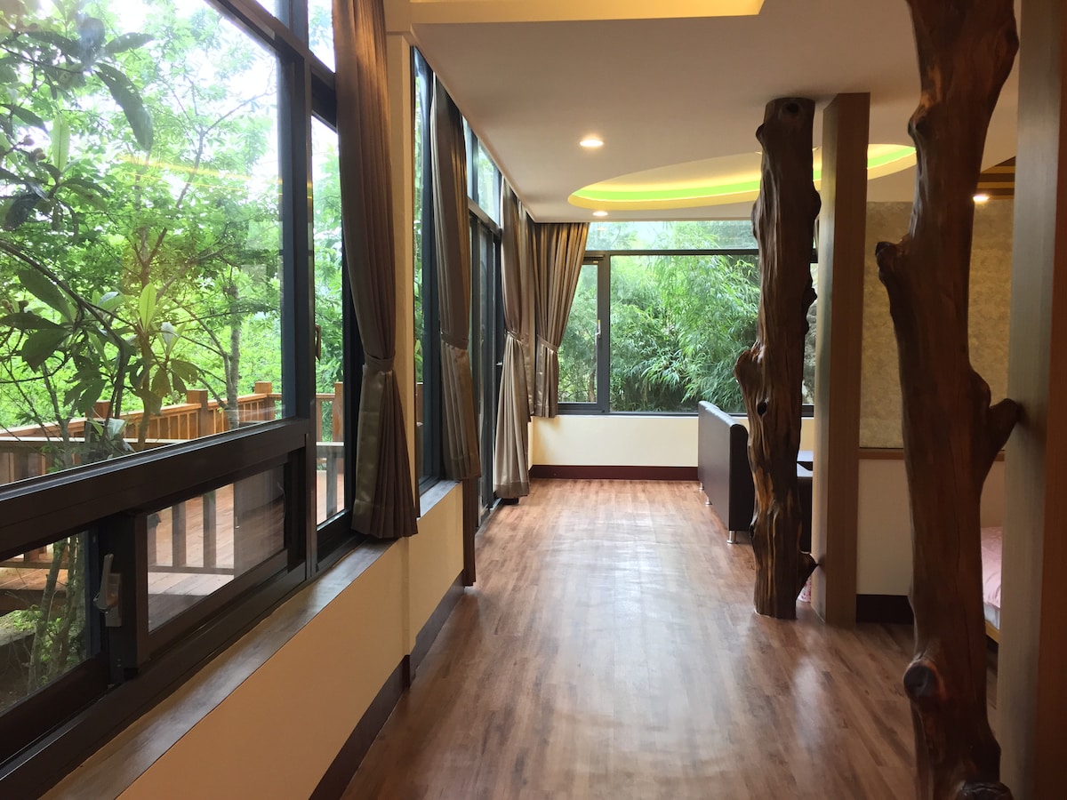 Położona u podnóża zamarzniętego szczytu słynnej mrożonej herbaty oolong, obok stawu Kirin i niekończącej się zieleń Wanping Park, sceneria gór jest absolutnie godna podziwu. Salon w drewnianym domu jest przestronny i zajmuje 15 tsubo. (Pojedynczy drewniany dom ma cztery pokoje, trzy pokoje dwuosobowe i trzy pokoje dwuosobowe dla łącznie sześciu pokoi.) Możesz zrobić herbatę i porozmawiać przy oryginalnym drewnianym stole. Światła w pokoju i żyrandole są wykonane z tajwańskiego drewna cyprysowego. Są bardzo wykwintne, więc goście mogą cieszyć się rodzinną atmosferą. Słynne atrakcje, takie jak Creekhead, Monster Village, znajduje się około 20 minut jazdy samochodem, Sun Yuetan znajduje się około godziny drogi, a Gathering Water znajduje się około godziny drogi stąd.
