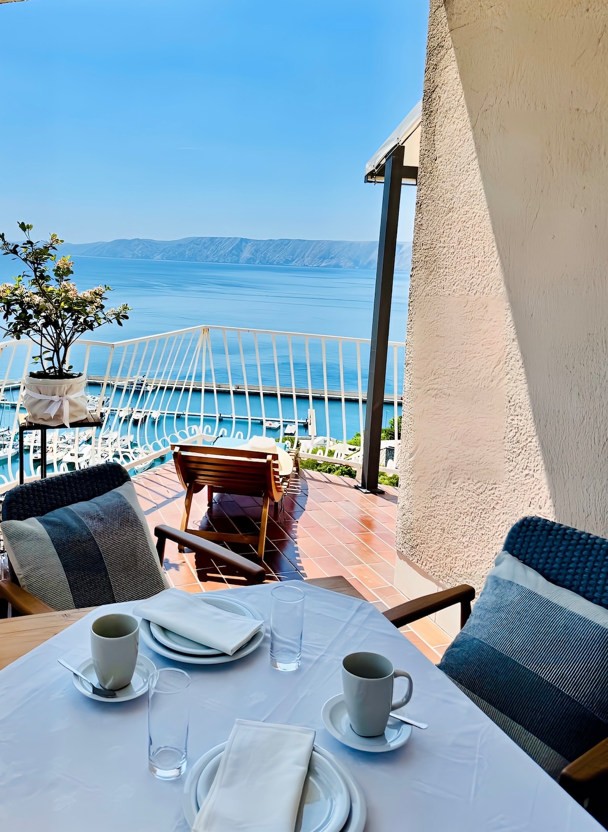 Widok na morze z przystani zaprasza do spędzania dni i wieczorów na balkonie – z widokiem na lśniące wody basenu bez krawędzi i Morze Adriatyckie. Niezależnie od tego, czy jest to kieliszek wina, czy cola, gra w Uno, czy najnowsza powieść, od razu poczujesz, że jesteś na wakacjach. A jeśli masz ochotę na plażę: wystarczy dziesięć minut spacerem, by znaleźć się na Riwierze Novi Vinodolski. Nawiasem mówiąc: Novi Vinodolski oznacza „Nowa Dolina Wina” – wystarczy zapytać naszego wielokrotnie nagradzanego winiarza