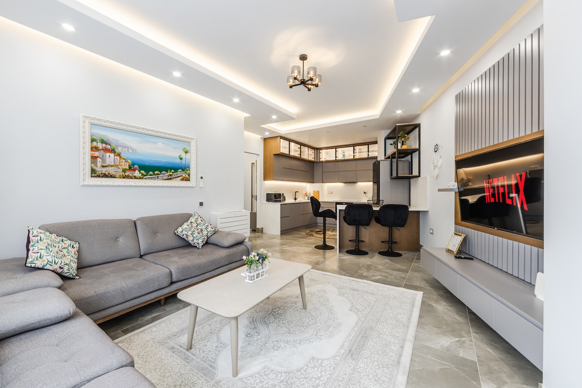 Zupełnie nowe mieszkanie o pięknym i relaksującym wystroju sprawi, że poczujesz się jak w domu. Tuż obok Nowego Bazaru, 6 minut do centrum. W pobliżu centrum handlowego Toptani, budynków rządowych, muzeów, opery, centrum medycznego. Apartament o powierzchni 104 m2, 3 piętro z windą, w pełni umeblowany, posiada 1 sypialnię (łóżko małżeńskie) 1 sypialnia (2 pojedyncze łóżka), kuchnia (piekarnik, zmywarka itp.), przestronny salon, 2 toalety, bezpłatny parking. Telewizor, klimatyzacja w każdym pokoju, zmywarka, pralka.