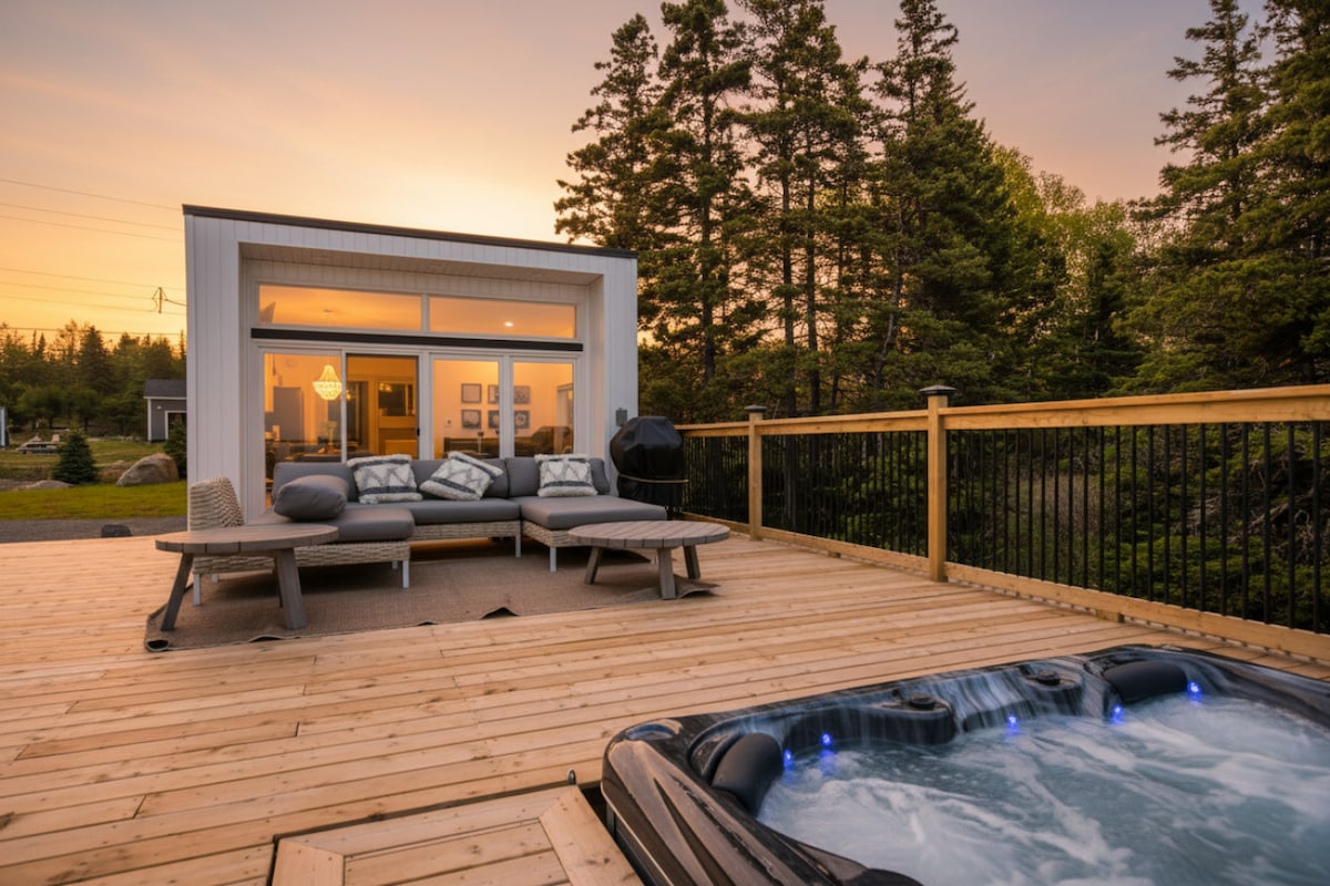 Otoczony tarasem o powierzchni 4000 stóp kwadratowych, wyposażony w duży podgrzewany basen, wannę z hydromasażem i prywatną panoramiczną saunę kopułową, jest idealną bazą wypadową do zwiedzania najlepszych plaż w Nowej Szkocji lub po prostu ucieczki od tego wszystkiego. Pamiętaj, że podgrzewany basen działa tylko od połowy października - do połowy listopada. Sauna, wanna z hydromasażem i kopuła są otwarte przez cały rok.