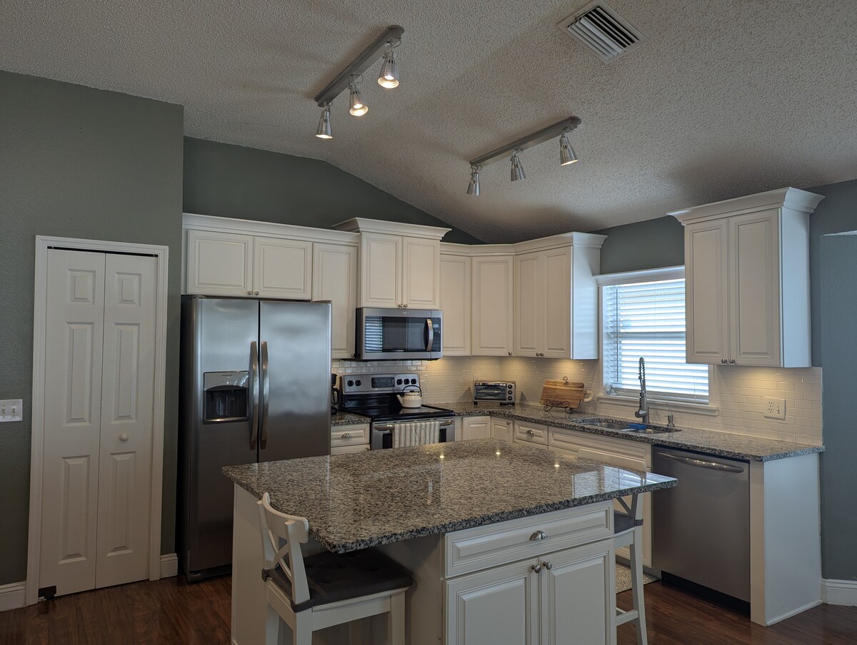 Odnowiony z nowymi urządzeniami, 3 sypialnie, 2 łazienki, jadalnia, kuchnia ze zmywarką, kuchenka mikrofalowa, szklana kuchenka, piekarnik konwekcyjny, duże podwórko z potokiem, parking na podjeździe. Centralnie położone w Tampa Bay Area, FL. Pół godziny od międzynarodowego lotniska w Tampie, godzinę drogi od Disneya, Seaworld, centrum Epcot, studia Universal i innych rozrywek. Enjoy Busch Gardens, Ben T.Davis beach 1/2 hour away or drive a hour to the world famous Clearwater beach and enjoy the white sand.