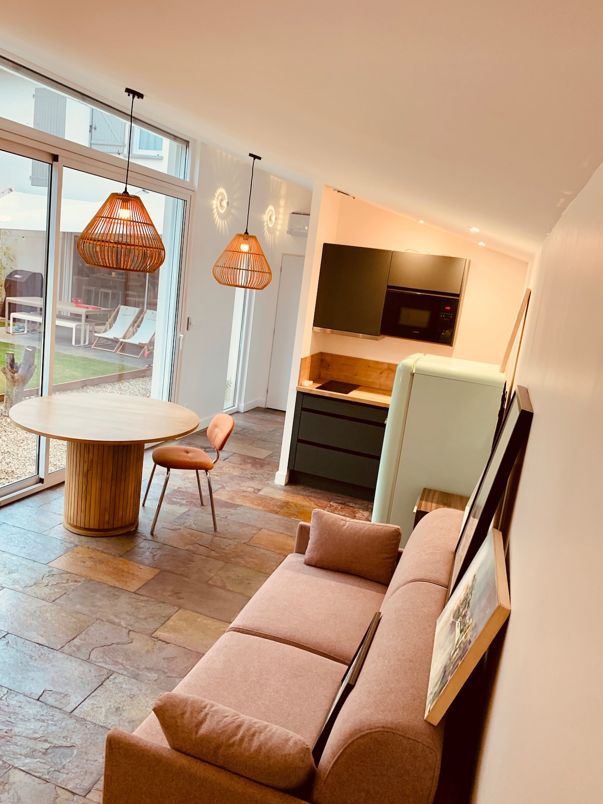 Logement haut de gamme pour 2 personnes calme, sécurisé, indépendant confortable et stylé, 2 terrasses, grand espace vert, SPA sous dome 30 mn offert, salle de sport, pret gratuit de vélos, piscine, SAUNA 30 mn offert, jeu de petanque. Entièrement meublé, cuisine équipée, plaques induction, four frigo, vaisselle couvert cafetières bouilloire café thé. Lumineux, literie neuve 160x200, draps fournis, linges de toilette. TV gd écran 110 cm, internet, Parking intérieur sécurisé. Ballades, ping pong