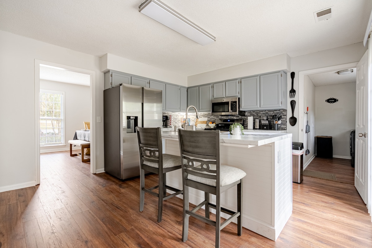 Wejdź do komfortu tego jasnego prywatnego domu z 3 sypialniami i 2 łazienkami z wyjątkowymi udogodnieniami w spokojnym mieście Mableton w stanie Georgia. Położony w spokojnej okolicy, dom obiecuje wygodny wypoczynek w pobliżu głównych atrakcji miasta, zabytków i w odległości krótkiej przejażdżki od centrum Atlanty w stanie Georgia. Nowoczesny wystrój i bogata lista udogodnień zaspokoją Twoje potrzeby ✔ 3 wygodne BR (1 duże łóżko podwójne, 1 duże łóżko podwójne, 1 łóżko pojedyncze + 1 łóżko piętrowe)