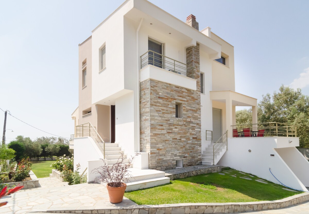 Dwupiętrowa willa z poddaszem na 400-metrowej działce. Idealna do relaksu i spokoju. Przestronne, słoneczne, chłodne wnętrzawtrz. Werandy i miejsca na świeżym powietrzu do opalania, zabawy, grillowania. Zaledwie kilka kroków od morza. Przytulna, komfortowa, elegancko urządzona w stylu plażowym, zapewniająca wszelkie udogodnienia na niezapomniane chwile wypoczynku. Zaledwie dziesięć minut jazdy od Peramos i Touzla, centrów miejskich tego obszaru. Z wieloma unikalnymi plażami na każdy gust w zasięgu ręki.