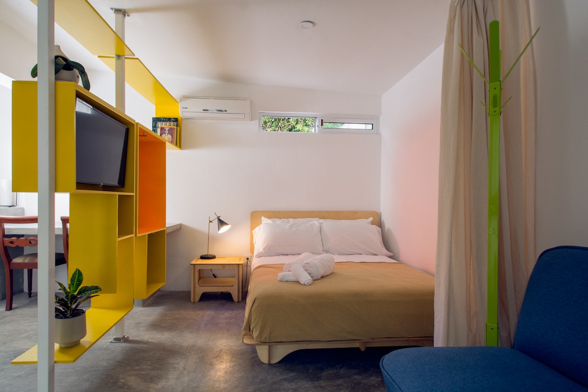 Wyposażenie: Wi-Fi 2 pokoje z łóżkiem typu Queen Size i klimatyzacją. 2 pojedyncze sofy w pokoju z klimatyzacją. Pokój z telewizorem Smart TV 32” (w tym Netflix) Salon z puffami. W pełni wyposażona kuchnia z kuchenką, patelnią, kuchenką mikrofalową i lodówką na żywność. Stół z talerzami, szklankami i przyborami. Łazienka i prysznic (gorąca woda). Pralka do prania brudnej odzieży. Kamera bezpieczeństwa. Zestaw powitalny: Kawa, 4 napoje bezalkoholowe, 2 wody i 2 piwa