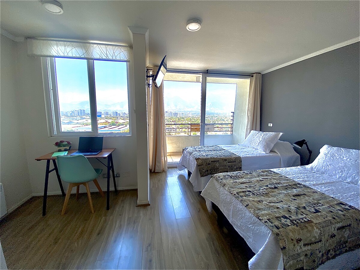 Nowoczesne, zadbane studio w Santiago, w cichej okolicy La Florida, zaledwie 2 minuty 🚇 od stacji metra Bellavista La Florida i centrum handlowego Vespucio. Wszystko w odległości spaceru: supermarkety, kliniki, apteki, restauracje i podstawowe usługi. Idealne dla par, turystów lub na wyjazdy służbowe. Klimatyzacja ❄️, szybkie Wi-Fi 📶, kuchnia, smart TV 55”, nowoczesna łazienka z + suszarka 🚿, biurko/stół, taras z widokiem na miasto i góry 🌃, łatwe zameldowanie.