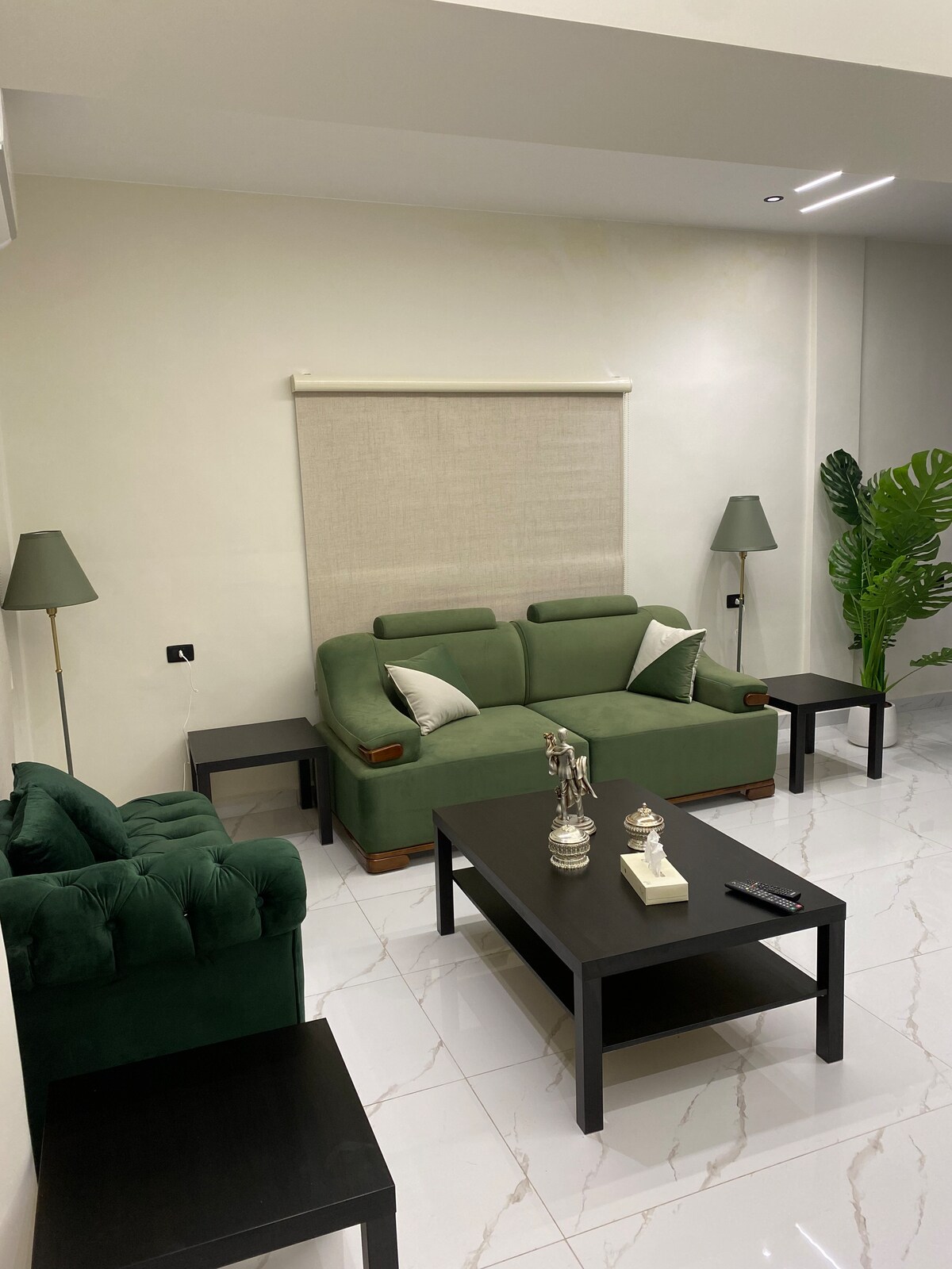 Położone zaledwie kilka minut od centrum miasta, w spokojnej i bezpiecznej okolicy, to nowoczesne mieszkanie jest idealne dla par, rodzin lub osób podróżujących służbowo, które szukają komfortu i prywatności. W apartamencie znajduje się jasna i przestronna część dzienna z elegancką marmurową podłogą, przytulnymi zielonymi aksamitnymi sofami i nowoczesnym oświetleniem, które tworzy ciepłą i relaksującą atmosferę. Duże okna z roletami zapewniają naturalne światło w ciągu dnia, a w nocy tworzą kameralną atmosferę.