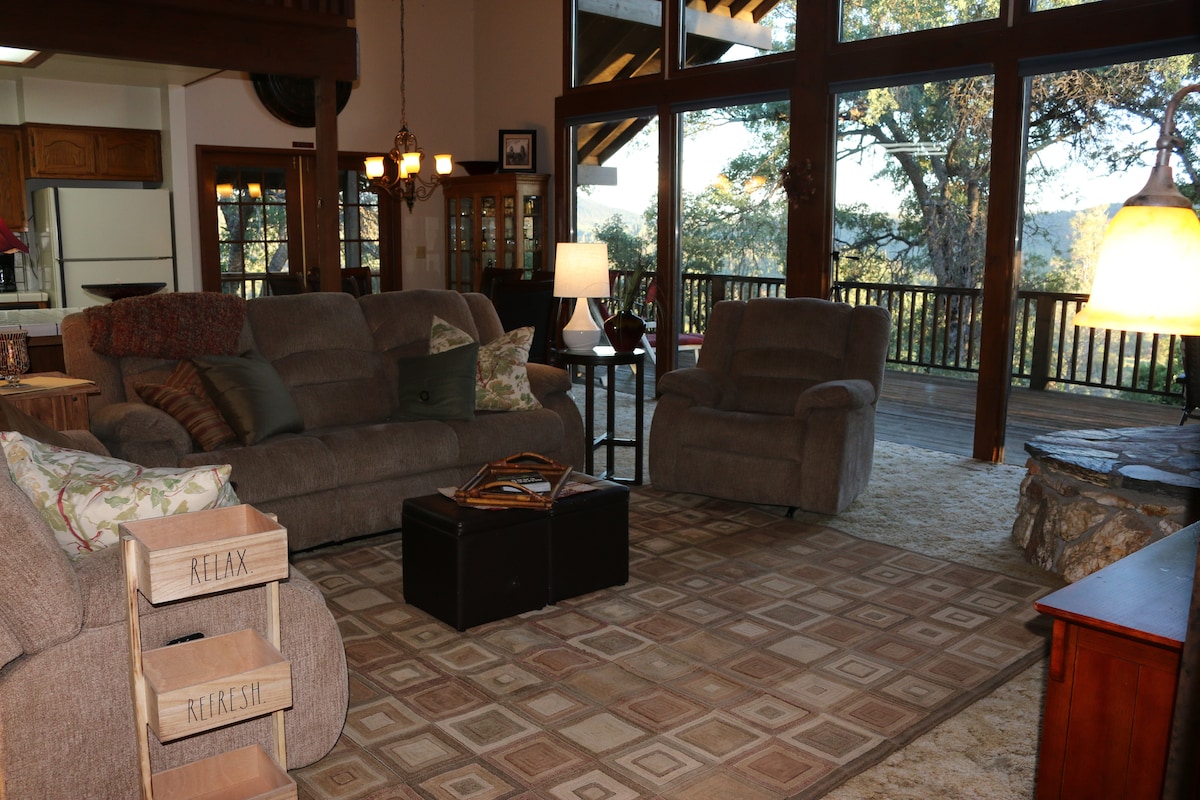 To piękny, zbudowany na zamówienie dom z widokiem na góry. Idealne na 4 sezonowy wypad. Wspaniały widok na górę z salonu, pokoju gier i głównej sypialni. Ciesz się dwoma tarasami zewnętrznymi, aby się zrelaksować, czując się jak w lesie. Brazylijskie drewniane podłogi i dębowa podłoga Szybki (1000 Mb/s) Internet, Wi-Fi przez dom Tylko 18 mil od południowego wejścia do Yosemite, 9 mil od Bass Lake, około 3 mil od sklepu spożywczego i restauracji w Oakhurst