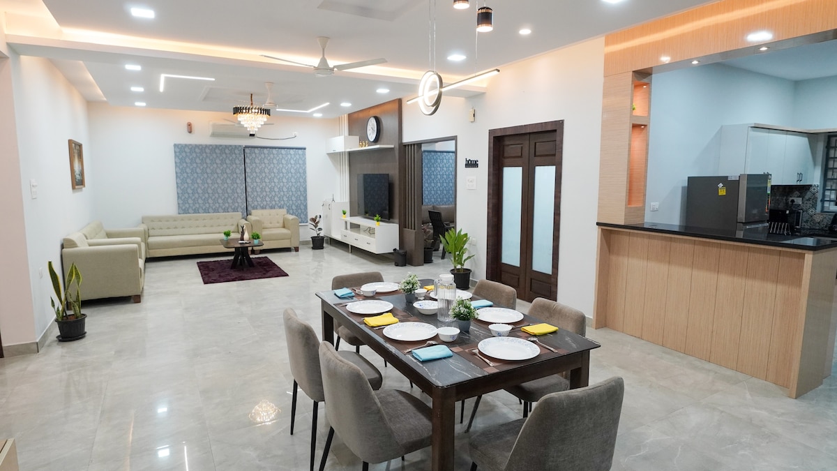 Indulge in a luxe triplex villa with serene lake views near Kondapur in the heart of the city- Hyderabad. Elegant interiors, a private projector lounge,indoor board games, a curated book collection and a sunset terrace create the perfect escape.Spacious yet tranquil, it’s ideal for families & friends seeking sophistication. Thoughtfully designed for comfort, every corner offers a mix of style and warmth. 25min to Hitech, 20 to AMB Gachibowli, 50 min to Airport,10 min to quake