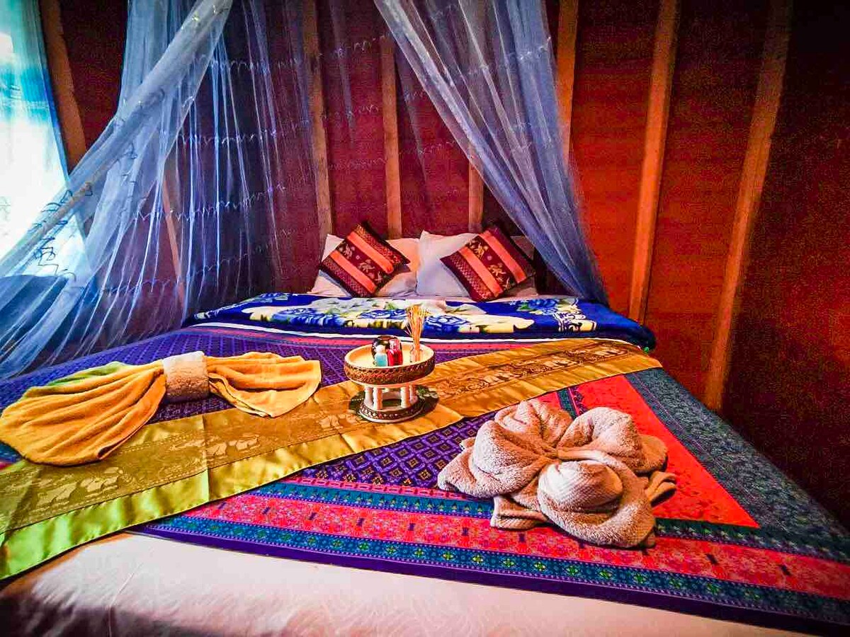 w naszym bungalowie znajdują się bambusowe domy, w chatach znaleźć można tradycyjne korzenie trawiaste. w pobliżu wioski Karen Hill, widoki na dżunglę, małż i spokojny kemping - ziemia otoczona wodospadem,rzeką i górami. dom jest odpowiedni dla par lub przyjaciół z dużym łóżkiem i może dodać 2 dodatkowe łóżko dla rodziny. możesz zarezerwować jednodniowe wycieczki i przenocować.