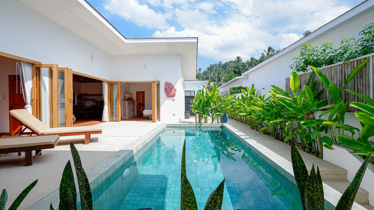Stunning and newly constructed 3-bed, 3.5 bathrooms modern villa in Koh Samui, in a quiet area just a 3 min ride or 10/15 mn walk from a pristine beach. Sleek design, spacious living areas, and private pool. Fully equipped kitchen, Wi-Fi, and AC. Perfect for families or groups seeking luxury and convenience. Several restaurants , bakery and massage salon , just around the corner . Relax in style, steps from turquoise waters and vibrant local scene. Ideal for an unforgettable island getaway!