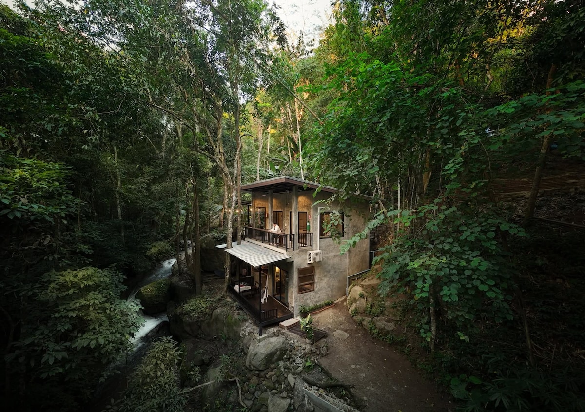 Prywatna kryjówka w dzungli w dzielnicy Huai Kaeo w Chiang Mai z potokiem i wodospadem tuż obok. Zasypiaj przy szumie wody, budź się w otoczeniu zieleni i spędzaj wieczory przy ognisku Dlaczego to miejsce Ci się spodoba: – strumień i wodospad (przepływ wody różni się w zależności od pory roku) – Balkon z hamakiem na drzewach – Wieczory przy ognisku pod baldachimem dżungli – 2 sypialnie + 2 łazienki (idealny dla par, przyjaciół, małych rodzin) – Klimatyzacja + w pełni wyposażona kuchnia zapewniająca komfortowy pobyt