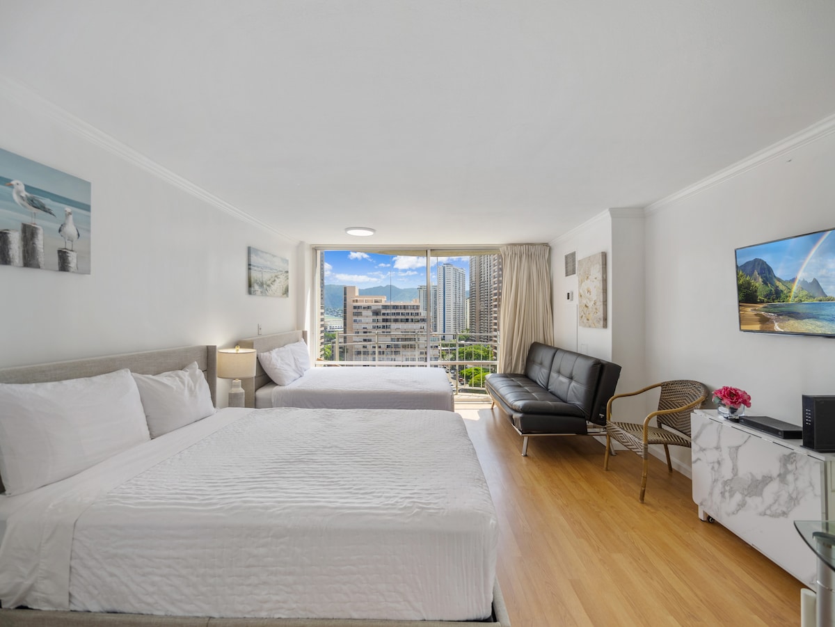 Newly renovated studio in an amazing location across the street from the beach and Hilton Hawaiian Village Lagoon. 5th floor oceanside unit comes with a free parking space! Swimming pool, beach gear, toys, and games! Enjoy our complimentary water and treats! We extra clean and sanitize our space! We made our place more like home then a hotel room. We also love to share the local knowledge. A long time traveler and local guide giving back to the traveling community. Aloha nui loa!!!