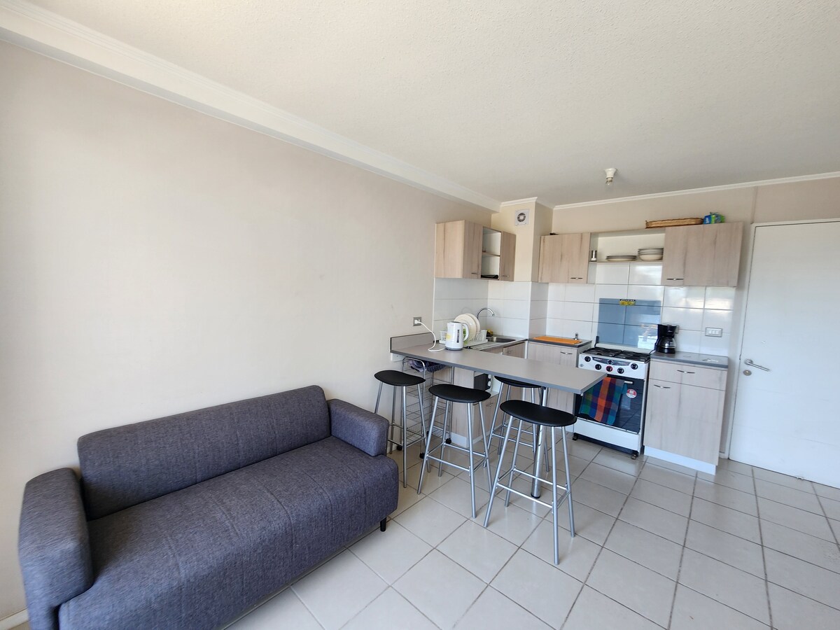 A 20 min en auto del centro en auto a pasos de ruta 5 . Condominio tranquilo con piscina y áreas comunes. Segundo piso. 🛏️ Dormitorio principal + dormitorio 2 con 2 camas de 1 plaza 🚿 3 baños + lavadora 🍳 Cocina equipada (gas, microondas, hervidor) 🚗 Estacionamiento 💡 Incluye agua, luz, gas, GC e internet. 🆕 Remodelado enero 2026: piso, pintura y colchones nuevos. 📅 Mínimo 7 noches. Ideal trabajo o estadías largas.