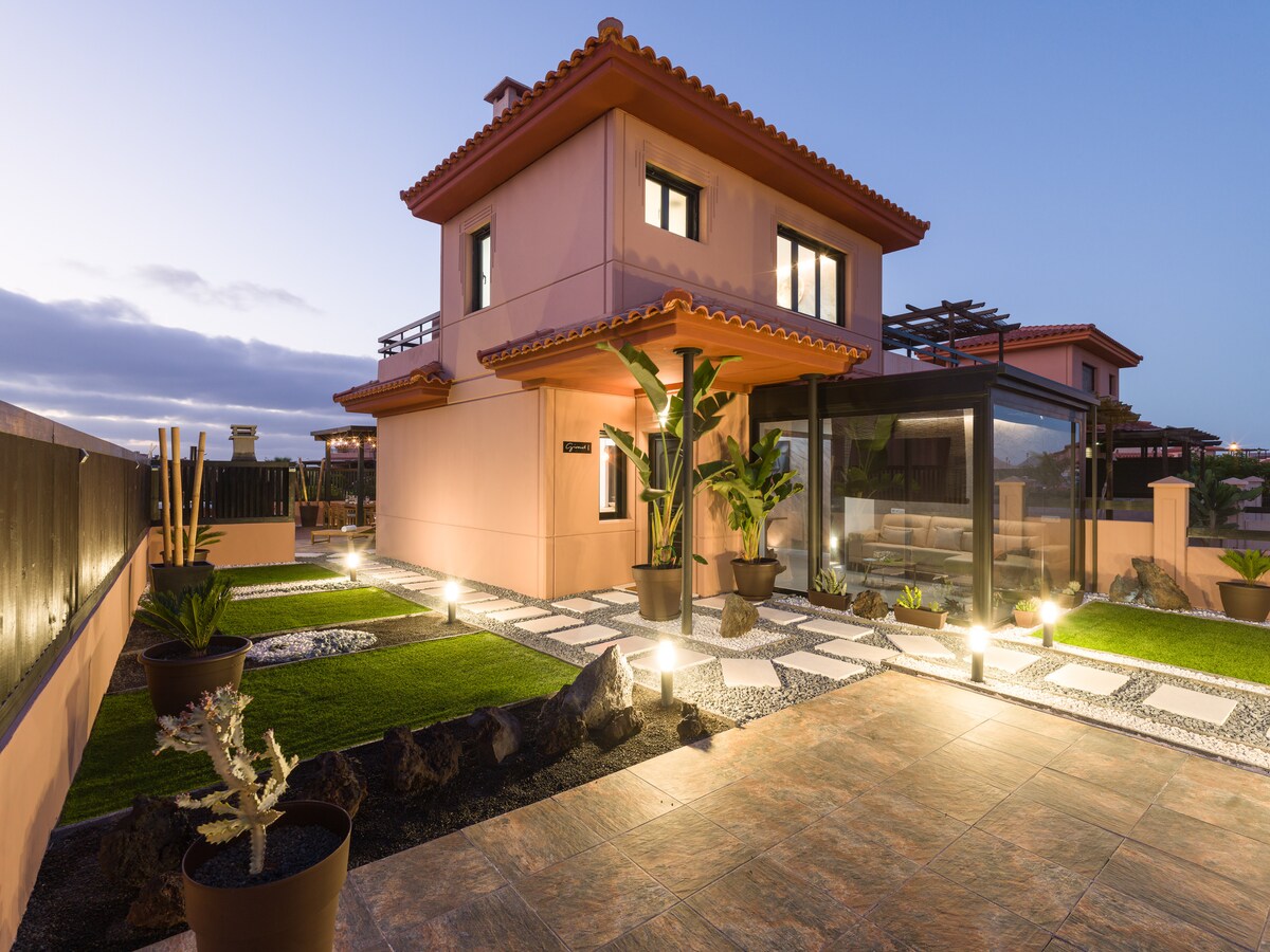 Nous sommes super hôte depuis 9 ans avec avis 5 étoiles. Nous avons créé ce logement cosy où tout est neuf afin que vous passiez des vacances de rêves.. Détendez-vous cette charmante petite maison mitoyenne calme et élégante complètement privative. Vous pourrez accéder aussi à une belle piscine. Tout près du meilleur spot de surf, et à 10 min de tous les commerces et restaurants de Lajares.