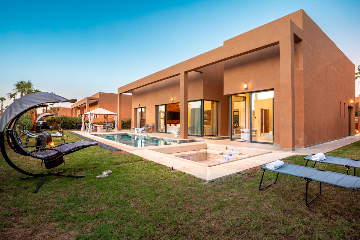 Odkryj naszą willę w pięknym klubie golfowym Samanah, oferującą ciszę i spokój. Zaledwie 15 minut od centrum miasta i lotniska, ten klimatyzowany obiekt o powierzchni 200 m² oferuje wiele tarasów, ogromny i prywatny bujny ogród oraz prywatny basen (ogrzewanie jest dostępne na życzenie) z oszałamiającymi widokami na zachód słońca. Ciesz się wspaniałym polem golfowym zaprojektowanym przez Nicklausa i dźwiękiem ptaków. Poczuj marokańską atmosferę Beldi Chic na niezapomniany pobyt. Całodobowa ochrona zapewnia spokój ducha.