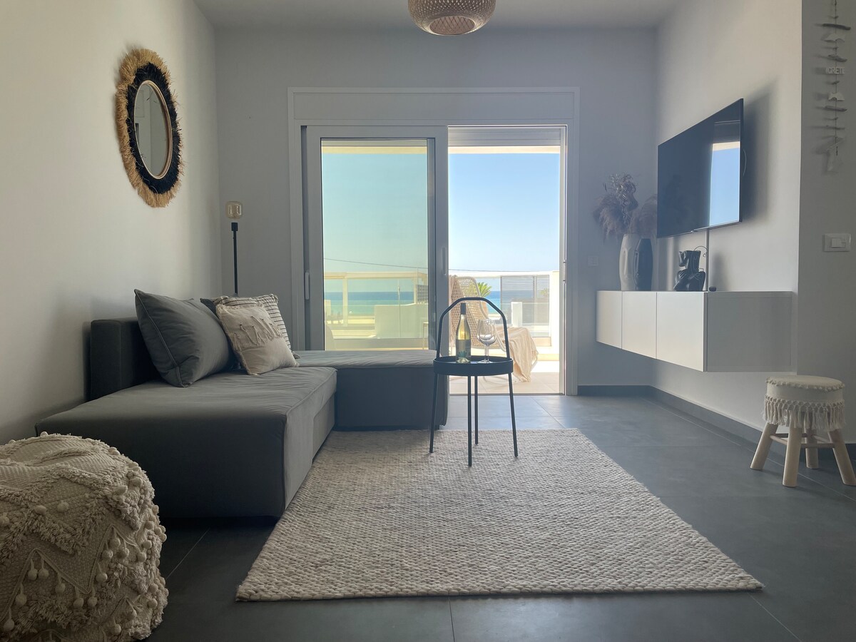 Απολαύστε γαλήνιες διακοπές στη θάλασσα! Ξυπνήστε το πρωί βλέποντας από το κρεβάτι σας μια μοναδική ανατολή ηλίου. Χαλαρώστε στο υπαίθριο τζακούζι, στην κοινόχρηστη πισίνα, τις βεράντες, ακούγοντας τον ήχο των κυμάτων και το κελάηδισμα των πουλιών. Η θέα παντού είναι εξαίσια. Μπροστά σας το απέραντο γαλάζιο του Κρητικού Πελάγους, γύρω σας η εντυπωσιακή κρητική φύση. Από τα δύο σαλόνια ως τις κρεβατοκάμαρες, την τραπεζαρία, την κουζίνα, τα μπάνια, το υπαίθριο ντους, η θέα είναι συναρπαστική.