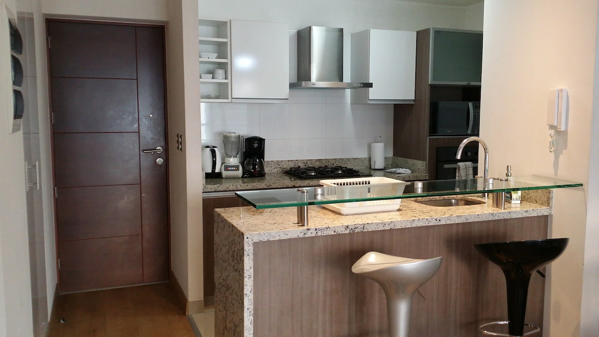 Położony w turystycznej dzielnicy Miraflores, 5 minut spacerem od miejsc turystycznych, takich jak Park Kennedy'ego i Larco Mar, 1 minutę od dworca autobusowego, w pobliżu supermarketów, sklepów spożywczych i restauracji. Super wygodny, przestronny, oświetlony i przytulny. Łóżko typu queen z materacem pierwszej klasy, aby Twój odpoczynek był przyjemny, 2-osobowa sofa, w pełni wyposażona kuchnia, ciepła woda, pralka, 65-calowy telewizor. Budynek z grillem, miejscem na ognisko, coworkingiem i siłownią. Bezpieczna okolica.