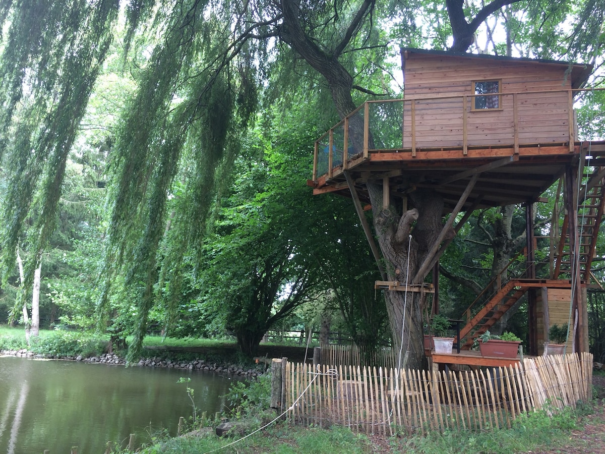 Spędź jedną lub więcej nocy w naszych domkach na drzewie z widokiem na staw, w którym możesz łowić ryby. Na zamkniętej działce o powierzchni 2 hektarów, w towarzystwie zwierząt, można cieszyć się grillem i podstawami gotowania. Zaplanuj pościel, kołdry lub narzuty i poszewki na poduszki. (łóżko 140/190 i łóżko wysuwane 2x80x200) Pragniemy wyjaśnić, że nasze chatki nie oferują usług na poziomie hoteli 5*. Na tarasie dostępny jest prysznic na świeżym powietrzu z gorącą wodą.