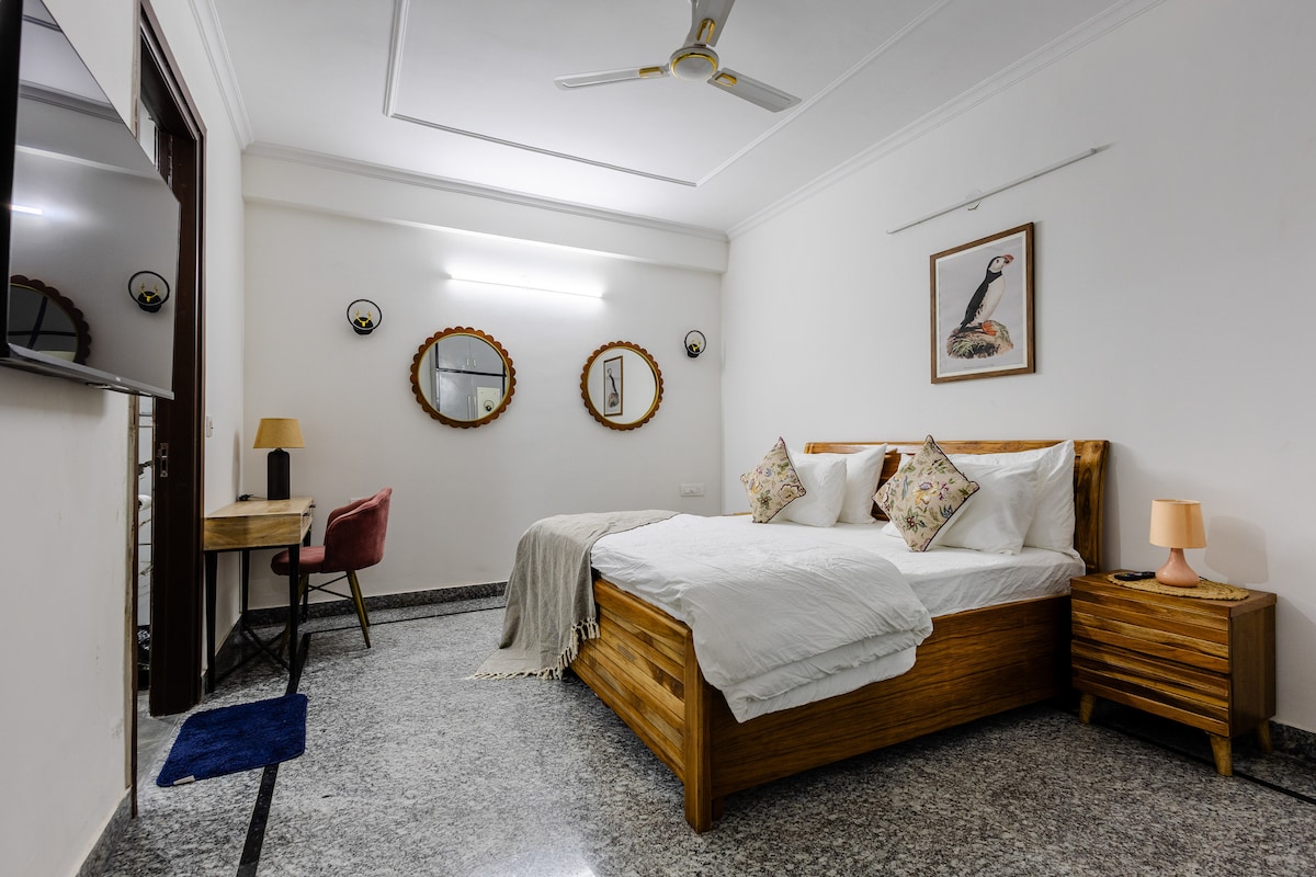 Ekskluzywny apartament 1BHK w Greater Kailash 1 (3. piętro, z windą) z prywatnym tarasem Skyline Lounge. Wnętrza obejmują 1 sypialnię, 1 salon, 2 podwójne łóżka, 1 łazienkę i kuchnię z 1 balkonem. Elegancki salon z łóżkiem typu diwan dla 3. i 4. gościa. Położony w eleganckiej, spokojnej, ogrodzonej kolonii klasy A w S-Block, ma 2 klimatyzatory, WiFi, 2 telewizory, pralkę i codzienne sprzątanie. Kuchnia jest w pełni funkcjonalna, wyposażona w sprzęt i sztućce. Słynny rynek M-block znajduje się w odległości krótkiego spaceru.