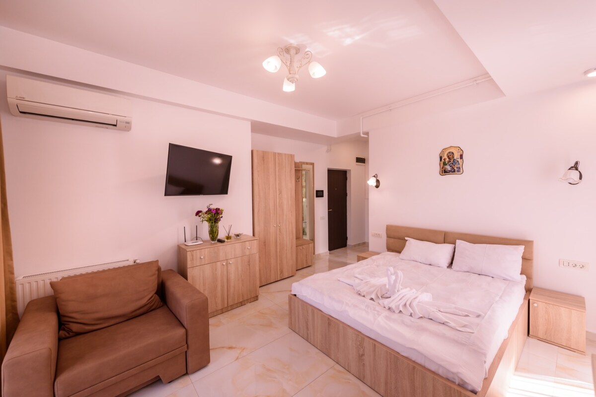 Życzymy udanych wakacji w naszym nowo urządzonym apartamencie z jedną sypialnią i wszystkimi udogodnieniami, których będziesz potrzebować. Central Mamaia, z oszałamiającym 180-stopniowym widokiem na jezioro, z pięknymi zachodami słońca, zaledwie 3 minuty spacerem od plaży.
