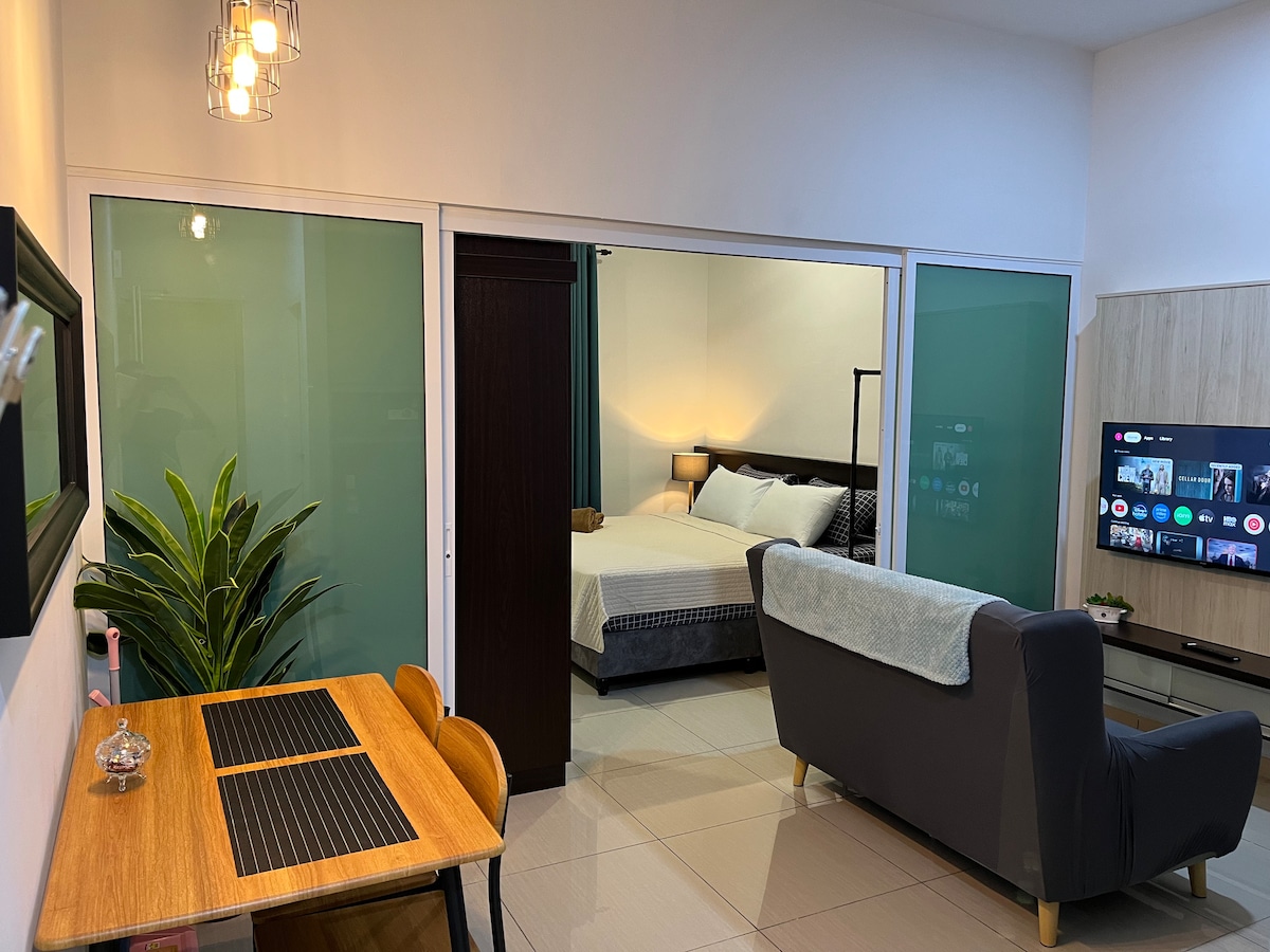Zrelaksuj się w tym przytulnym, w pełni wyposażonym, stylowym studio w nowym, luksusowym bloku mieszkalnym w pobliżu KLIA. Obok Mesamall z artykułami spożywczymi, restauracjami, kinem i nie tylko. Ciesz się łóżkiem typu king, Wi-Fi 200 Mb/s, telewizorem Google 43”, aneksem kuchennym, stołami do jadalni i pracy – idealne do odpoczynku lub pracy zdalnej. Zrelaksuj się w basenie bez krawędzi z widokiem na góry, zadbaj o kondycję w w pełni wyposażonej siłowni lub zrelaksuj się na dachu z pięknym widokiem. Idealne na krótkie lub długie pobyty. Niezależnie od tego, czy pracujesz zdalnie, czy przyjeżdżasz do biura, to miejsce sprawi, że poczujesz się jak w domu