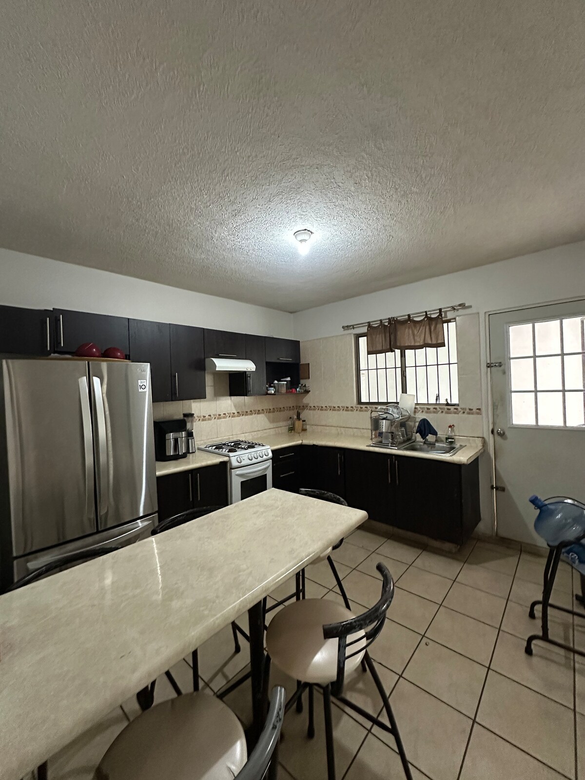 Casa de 4 recámaras, 3.5 baños, cochera cerrada 2 vehículos, ubicada en la mejor zona de la ciudad; fácil acceso a principales vialidades. Aire acondicionado, roku tv y ventilador en cada recámara; cocina equipada; lavandería con lavadora y secadora; internet de fibra óptica 100 megas; sala con sofá cama, escritorio, ventilador y smart tv; comedor y baños con ventiladores; patio trasero con asador; cerradura de clave; otras amenidades. Sala no tiene AA, solo dormitorios. Se factura