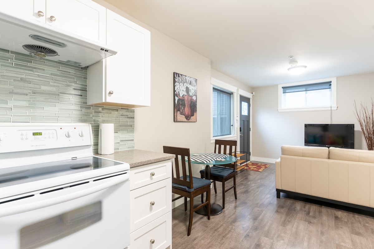 Witaj w jasnym i spokojnym domu w samym sercu North Vancouver! Ten w pełni prywatny apartament z jedną sypialnią jest idealny dla osób podróżujących w pojedynkę, par, pielęgniarek lub pracowników zdalnych, którzy szukają cichego, dobrze położonego i wygodnego miejsca na pobyt. Apartament został zbudowany zgodnie ze standardami domu pasywnego, dzięki czemu latem jest chłodny dzięki klimatyzacji, a zimą przytulny dzięki promiennikowemu ogrzewaniu podłogowemu – a wszystko to przy jednoczesnym oferowaniu udogodnień i przemyślanych akcentów, które sprawią, że Twój pobyt będzie bezproblemowy i relaksujący.