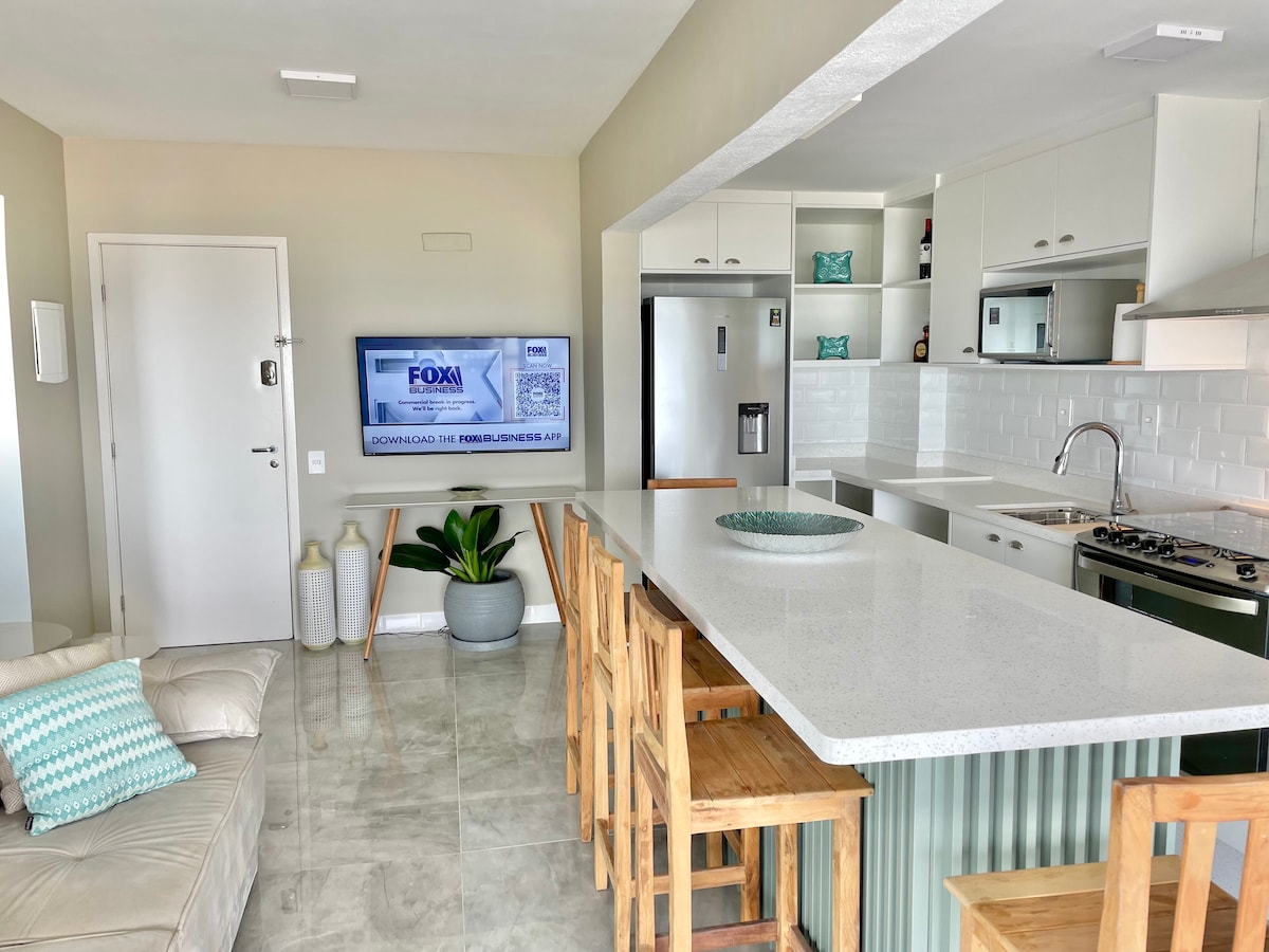 Piękny apartament z 2 sypialniami (1 z łazienką), klimatyzacja w każdym pokoju, telewizor w salonie i w sypialni; Wi-Fi, w pełni wyposażona kuchnia; pralka i suszarka. Wszystkie pokoje w apartamencie mają szeroki widok na morze (pokój dzienny, pralnia, kuchnia i dwie sypialnie). Energia 110 i 220; Budynek posiada baseny, sauny (suche i mokre), jacuzzi, salę gier, pokój zabaw, plac zabaw, siłownię, usługi plażowe (leżaki i parasole) oraz proste codzienne sprzątanie apartamentu, już wliczone. 1 miejsce parkingowe.