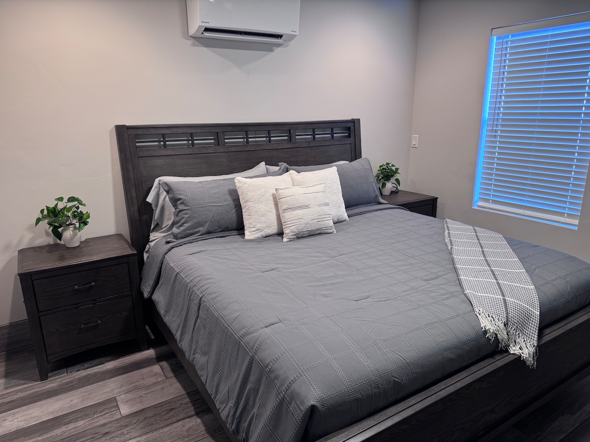 Nowa i nowoczesna prywatna 1-sypialniana przestrzeń apartamentu typu studio. Jedno super wygodne łóżko typu king size. Luksusowa łazienka z dużym prysznicem. Siedzisko i aneks kuchenny uzupełniają przestrzeń. W aneksie kuchennym nie ma kuchenki ani płyty grzewczej, ale jest wyposażony w pełnowymiarową lodówkę, zmywarkę i kuchenkę mikrofalową. Wszystko, czego potrzebujesz podczas krótkiego pobytu w pięknej Page, AZ! UWAGA: OD GRUDNIA 2023 ROKU W PAGE NIE JEST JUŻ DOSTĘPNA TELEWIZJA KABLOWA. TELEWIZORY MAJĄ APLIKACJE UŻYWAJĄCE WŁASNEGO LOGOWANIA
