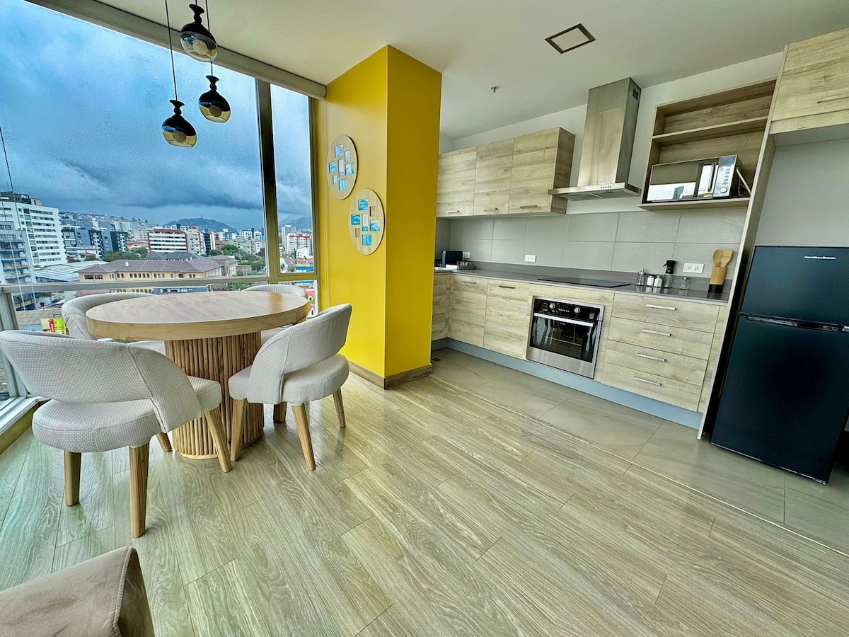 Studio Quiteño: wyjątkowa przestrzeń łącząca nowoczesny design z ekwadorskim dziedzictwem kulturowym i ciepłem andyjskich tkanin Idealne dla osób podróżujących służbowo, par i poszukiwaczy przygód, którzy chcą odkryć Quito z uprzywilejowanej lokalizacji - Zaledwie jedną przecznicę od Ecovía i 7 minut od metra Quito - 1 minuta od Multicentro i 10 minut od parku La Carolina i centrum handlowego El Jardín. - W otoczeniu restauracji, kawiarni i transportu publicznego, z łatwym dostępem do głównych atrakcji