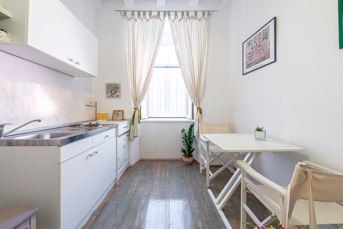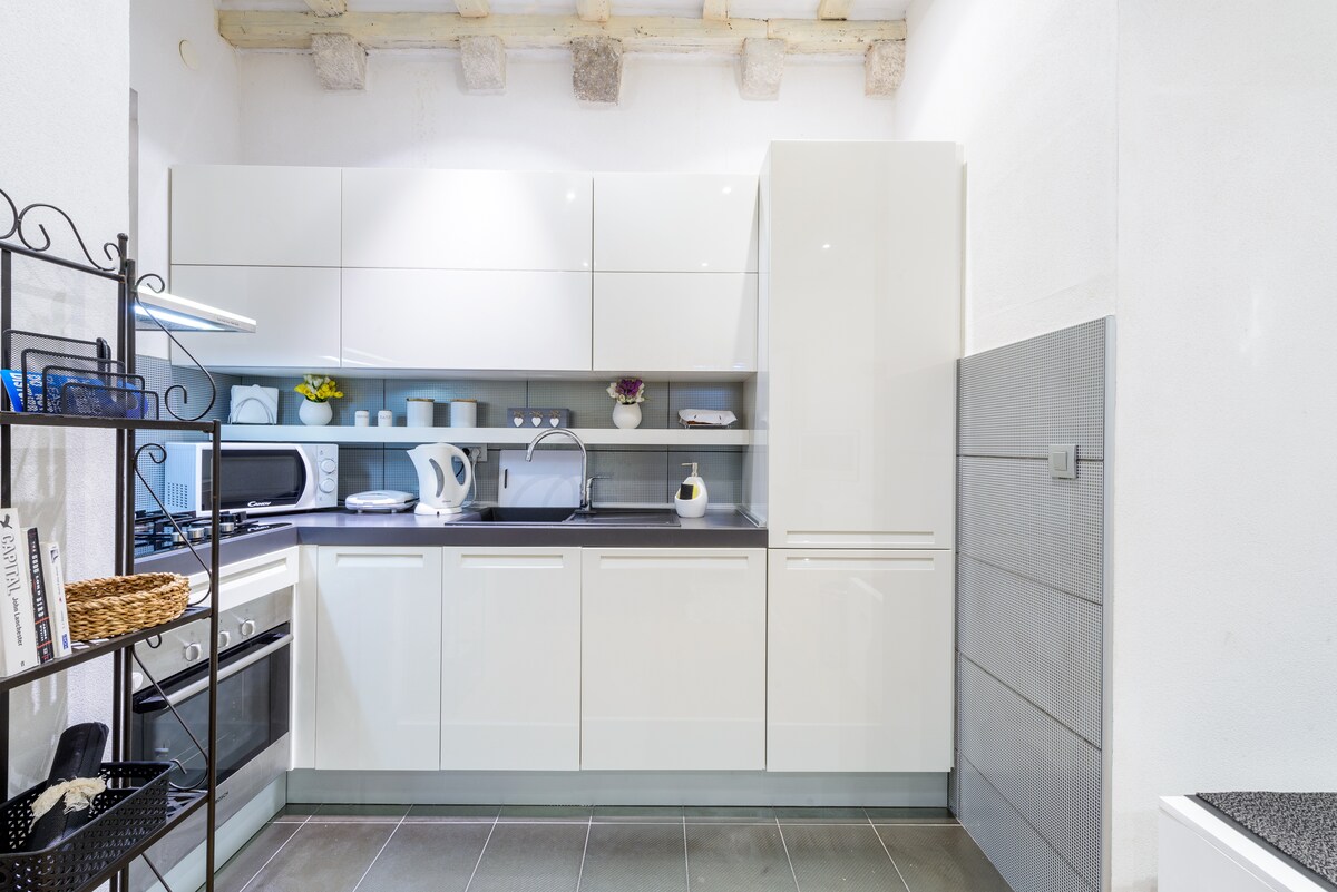 Nowoczesny apartament na pierwszym piętrze dla 3 osób, położony w samym sercu Starego Miasta w Dubrowniku. Znajduje się w nim jedna sypialnia z podwójnym łóżkiem, w pełni wyposażony aneks kuchenny, łazienka, salon z sofą, klimatyzacja, WiFi, telewizor, pralka, dźwiękoszczelne okna, czysta pościel i ręczniki, przystanek autobusowy 2 minuty spacerem, bliskość piekarni, barów, restauracji, plaż. Samodzielne zameldowanie w skrytce lub zameldowanie z pomocą gospodarza na życzenie. Zobacz nasze rekomendacje dotyczące miejsc do odwiedzenia