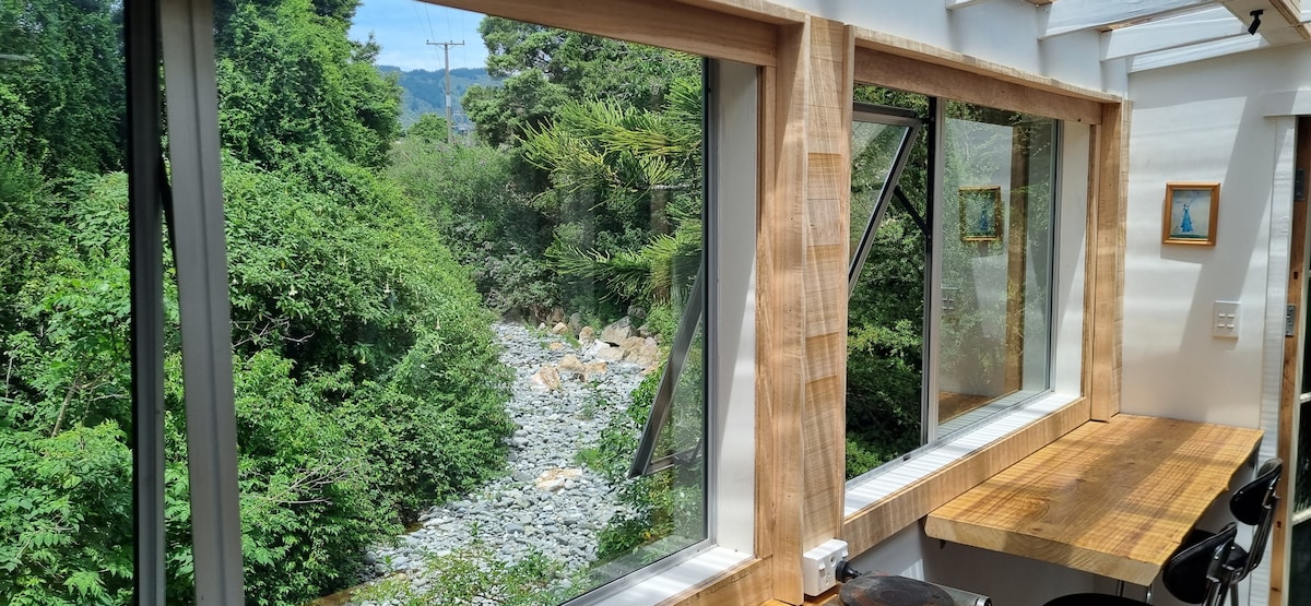 This is our sleepout located next to our family home. It is artistic and peaceful. It is nestled within a 1 ha property with established fruit trees and many things for families to do and play. The sleepout has a separate wash space/kitchenette and bathroom, about 7 metres away from the sleepout. The beach is right opposite the house, and Mapua is a 2-minute drive. It's an ideal space to land in before and/or after a hike in the Abel Tasman, which is only 30 minutes away from us.