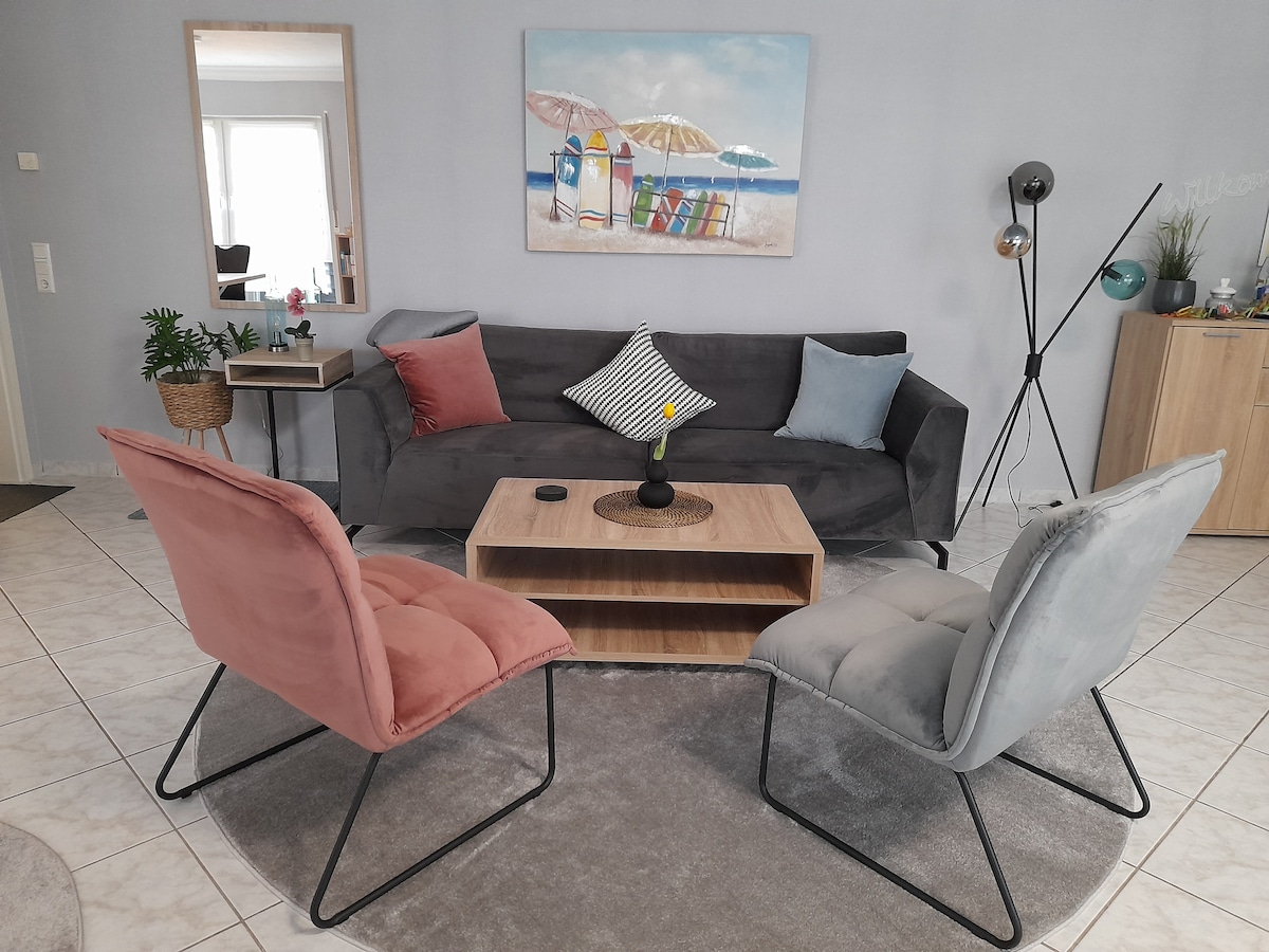 Nasze nowoczesne i komfortowo urządzone mieszkanie (ok. 50 m²) znajduje się w centrum stolicy kraju związkowego Saarbrücken. Mieszkanie znajduje się na wysokim parterze apartamentowca. Mieszkanie to mała oaza w mieście z balkonem i widokiem na zielony dziedziniec. Pięknie wyposażona kuchnia z nowoczesnymi urządzeniami, lodówką z zamrażarką i ekspresem do kawy Nespresso. Do dyspozycji gości jest wygodne łóżko typu king size (2x2m) i oczywiście szybki internet (WiFi).