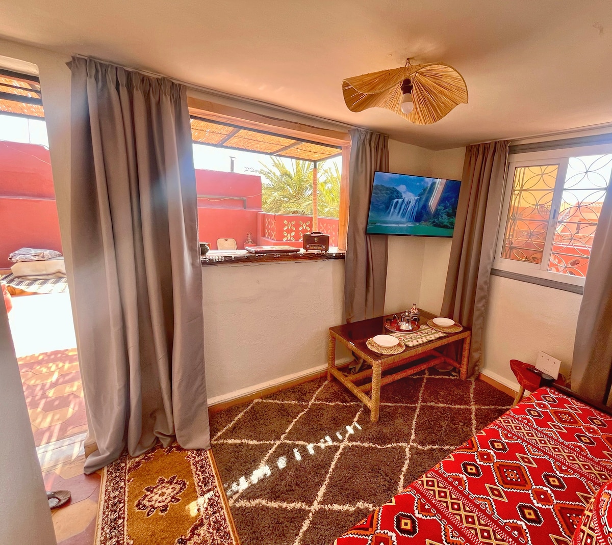 Witamy w Twojej prywatnej oazie w samym sercu Marrakeszu, tropikalnym studio zaprojektowanym wokół czystej i uspokajającej koncepcji. Tutaj każdy szczegół zachęca do relaksu wśród natury, światła i nowoczesnego komfortu • Mały prywatny basen na świeżym powietrzu, który zapewni Ci chwilę relaksu • Orzeźwiający prysznic na świeżym powietrzu, naturalny klimat • Tropikalny taras idealny do relaksu lub wspólnego posiłku • Przemyślany wystrój z naturalnymi odcieniami i materiałami.
