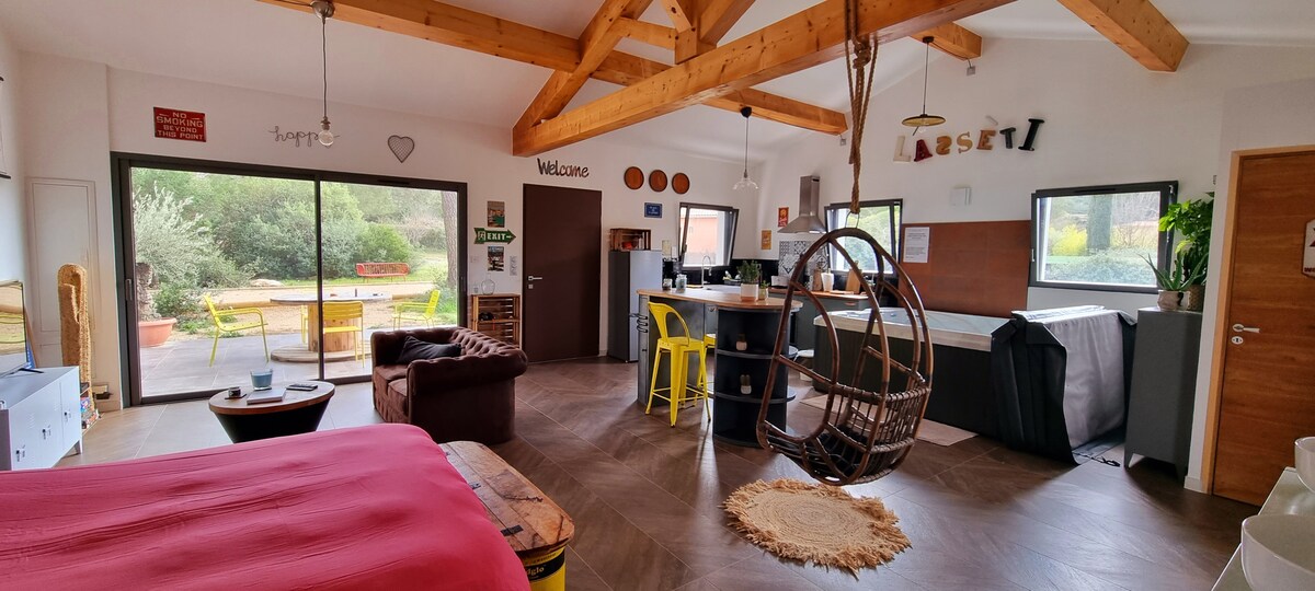 Chalet en bois indépendant avec cuisine, salle de bain avec douche, lavabo, toilettes sèches et chambre mansardée. Entouré du jardin, sans vis à vis, calme, en pleine nature, face à la montagne Sainte Victoire où vous pouvez vous reposer en toute tranquillité. Vous disposez d'un barbecue à gaz, table, chaises et fauteuils d'extérieur. L'accès à la piscine de la propriété est autorisé et non limité.