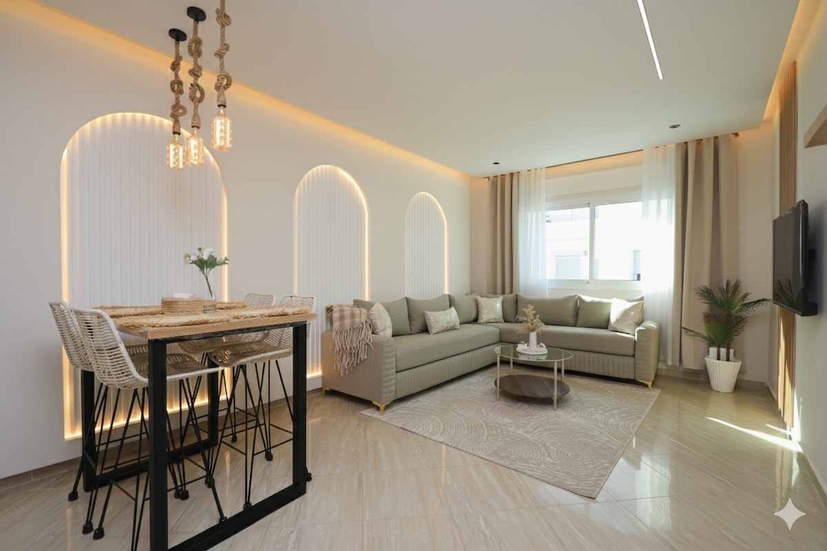 ✨Apartament Panoramiczny w Les Jardins Bleus charakteryzuje się nowoczesnym i eleganckim wystrojem, a każdy element został starannie zaprojektowany, aby zagwarantować niezapomniane wrażenia Centralne ✨położenie ✅ Apartament z panoramicznym widokiem na morze i w pobliżu: ✅ 1 min od plaży Martil 🏖 i słynnej Corniche ✅ 5 min do plaży Cabo Negro 🏝 ✅ 4 minuty od Ikea i KFC 🍗 ✅ 6 minut od Marjane i McDonald's 🍟 ✅ 1 min do restauracji, kawiarni, sklepów